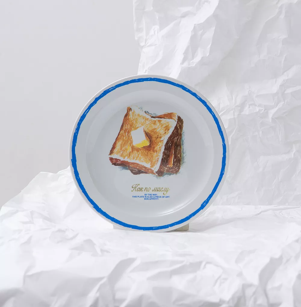 Для проекта Никатин создал серию работ, отсылающих к классическим натюрмортам или художникам, которые повлияли на его творчество. В основу легли фразеологизмы: «как рыба в воде», «на блюдечке с голубой каемочкой» и «как по маслу» — их художник иронично интерпретировал с помощью пастели. Алые рыбки в бокале с трубочкой передают привет Анри Матиссу, а пастельный тост с тающим маслом выглядит практически настоящим на плоскости керамической тарелки.