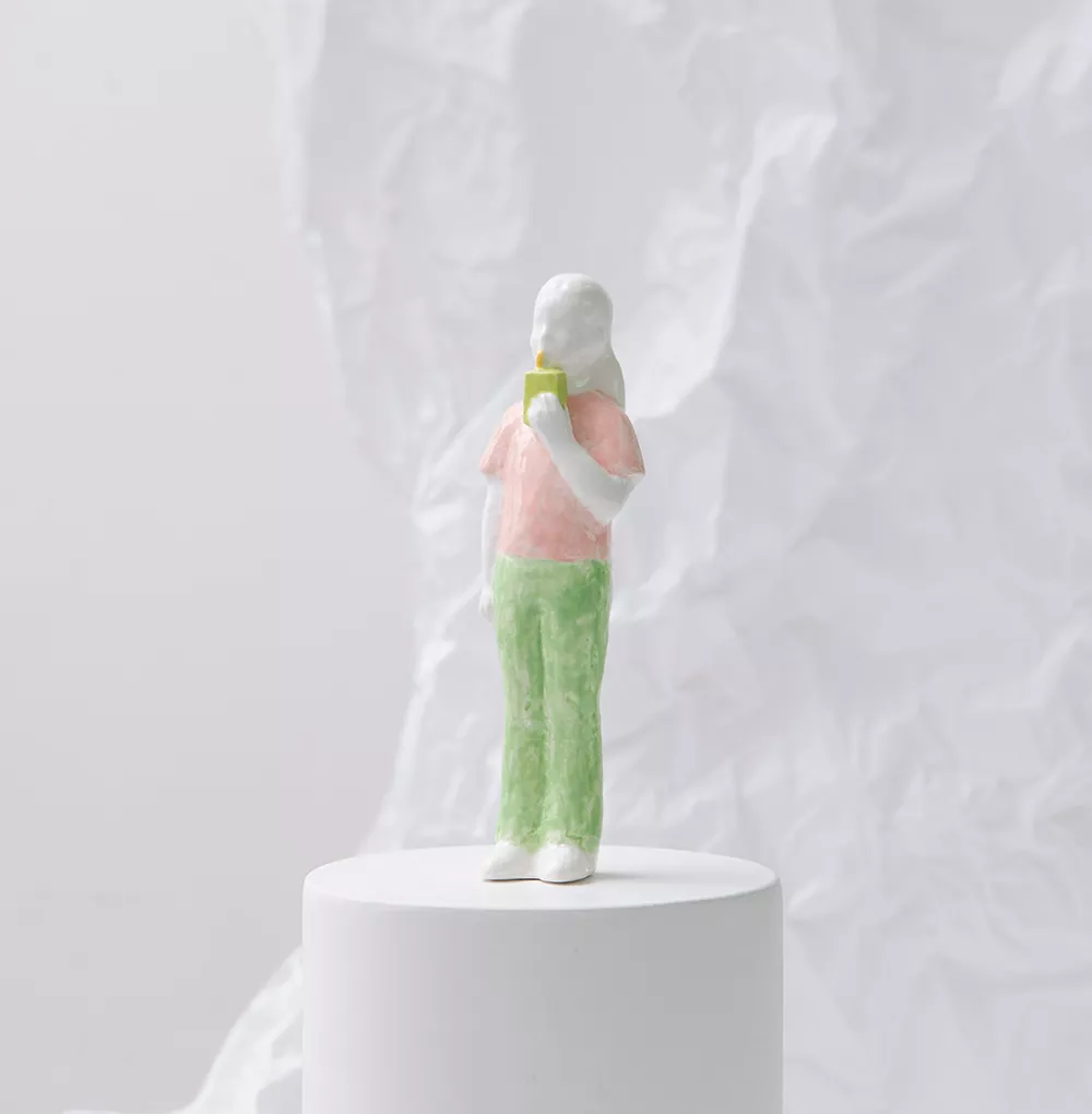 «Я ищу простые, но емкие образы и часто обращаюсь к бытовым сюжетам. Еда — неотъемлемая часть повседневной жизни человека, и у каждого из нас есть воспоминания, связанные именно с ней. Для проекта я выбрала сюжеты с любимой едой из моего детства. Я сделала две тиражные серии фарфоровых фигурок и остановилась на образах ребенка с пакетиком сока и кренделем. Сок с трубочкой ассоциируется у меня с детством, с переменками в школе, прогулками с друзьями и долгожданными полдниками. А вид кренделя всегда вызывал во мне очень трепетные чувства. Его форма напоминает мне сердце, поэтому я слепила мальчика, прижимающего крендель к груди. Керамическая клумба вдохновлена образом реальной клумбы рядом с моей мастерской, и «Клумбой дня» из инстаграма Саши Жиленко».