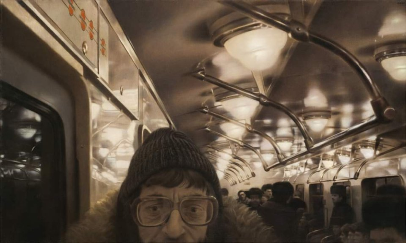 По образованию Файбисович архитектор и, как другие нонконформисты, картины писал в стол. Начинал с графики, потом начал учиться работать маслом. Жил в Ясеневе, а на работу в битком набитом транспорте ездил в центр. Как раз глядя на эту разношерстную ворчащую толпу, он увидел будущее искусство. Наброски по дороге в контору не особенно сделаешь, так что художник стал фотографировать попутчиков на пленку. Кадрами остался недоволен, но стоило им чуть отлежаться — и эти фотонаблюдения переросли в живопись. У Файбисовича реализм очень разный. Его пассажирка из цикла «Рейсовый автобус» абсолютно живая, кажется, ее можно окликнуть. С одной из самых известных картин Файбисовича на нас смотрит поэт Лев Рубинштейн, который стоит у дверей вагона метро. Просто не верится, что это масляная живопись, а не фотография, настолько живые детали на работе.