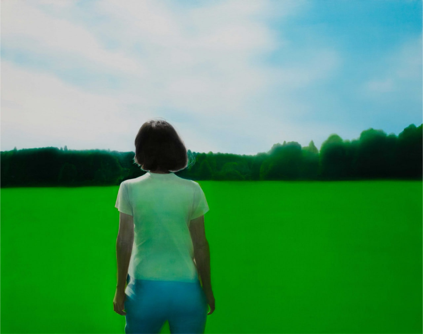Другая российская художница, Евгения Буравлева, выстраивает истории на картинах вокруг природы родной Кировской области. У нее узнаваемый стиль: необъятные ландшафты и портреты на их фоне, исключительно со спины. Получается будто отголосок Эндрю Уайета по колориту и по тому, как много воздуха на картине. В начале года у Буравлевой была выставка в Московском музее современного искусства совместно с галереей Futuro.