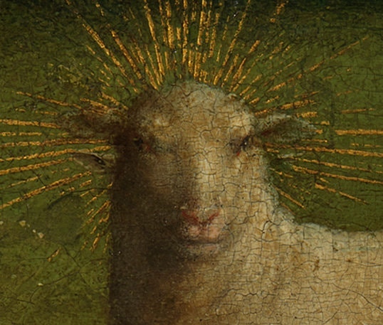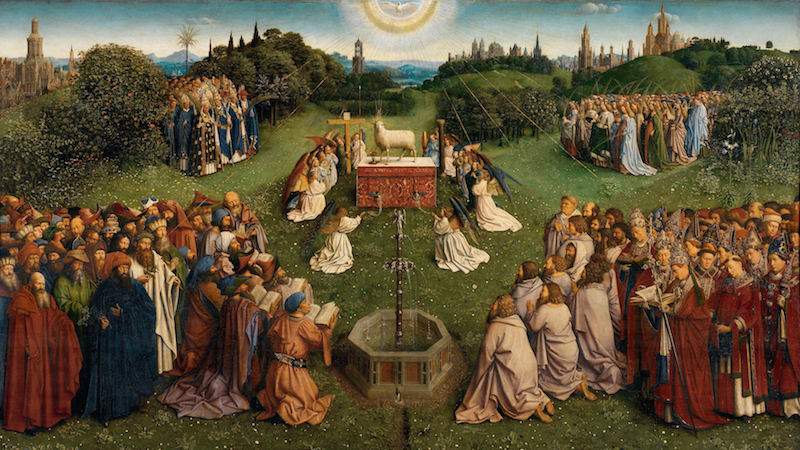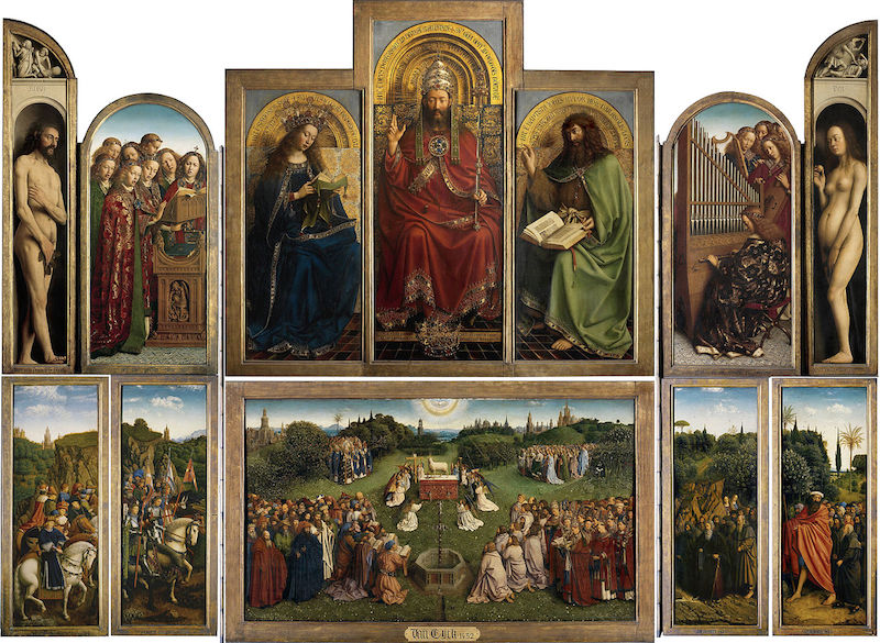 Гент — дом не ван Эйка, а тринадцатой работы на выставке, его опус магнума, Гентского алтаря. Написанный по заказу богатых мещан Йоса Вейдта и Елизаветы Борлют, алтарь с 258 персонажами, фантастическими городами, травами и цветами в беспрецедентной точности и подробности, первыми обнаженными фигурами к северу от Альп и убойной силой шедевра хранится в соборе Святого Бавона. У него крайне любопытная судьба: Гентский алтарь несколько раз увозился, разрезался идиотами, воровался по створкам, экспроприировался нацистами и наконец вернулся на родину после войны.