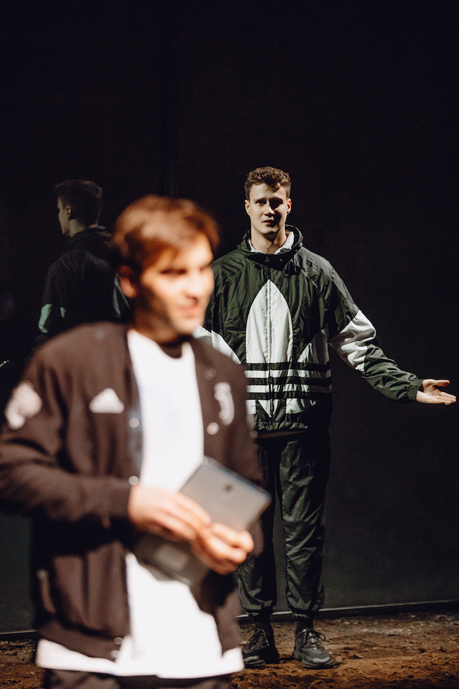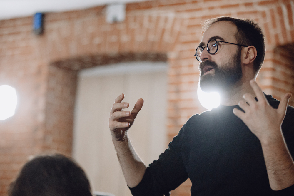 Маттео Спьяцци делится с актерами последними наработками и идеями на репетиции спектакля. Актерам и режиссеру через спектакль важно также донести то, что социальные сети в современном мире — это маски в реальной жизни и актуальное проявление комедии дель арте