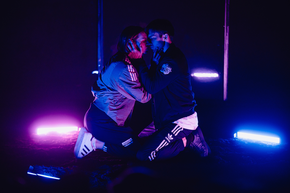 Неоновая подсветка — особое художественное решение. В течение всего спектакля визуальность создает необходимую атмосферу