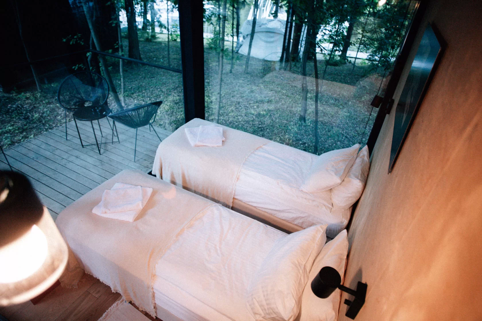 Тут нам особенно понравились два типа домиков — «квадрум» и овальный «футуро», немного похожий не то на архитектурные проекты 1960-х, не то на летающую тарелку (правда, из дерева). У обоих оборудованы веранды с мебелью и мангалом. Еще на территории есть дровяная баня, открытый бассейн и ресторан — с блюдами итальянской, европейской и русской кухни.