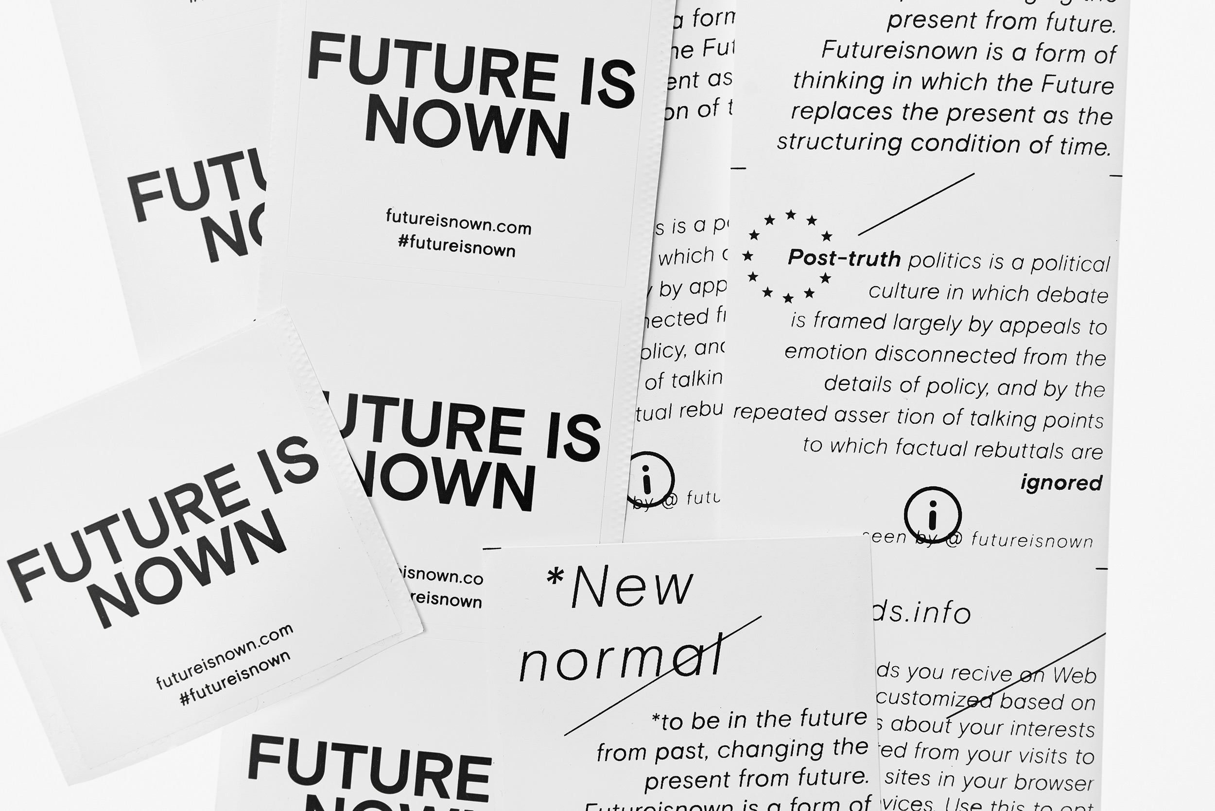 Я начал с детального изучения технологий и их использования в современных коммерческих, социальных и политических контекстах. Сформулировал миссию, цели и задачи проекта, его органику и стратегии. Futureisnown — это обозначение новой реальности и формирование объектов в ней. Проект через художественные практики стремится к созданию публичного дискурса и формированию критического мышления в восприятии окружающих процессов. Для него важна открытая и взаимообратная связи между технологиями, человеком и социально-политическими институтами в решении этических вопросов взаимодействия технологий с обществом.