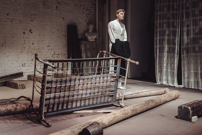 Впрочем, место определить ничем не проще. Вместо пышного особняка Раневских перед зрителями открывается простая, даже аскетичная и брутальная декорация, которую легче представить в пьесе «На дне» Максима Горького. Всё, что есть на сцене, — это дощатая чугунная кровать, три деревянных бруса и два длинных бревна, переходящих из спектакля в спектакль. «Создавалось пространство усадьбы. Детская — это ключевой момент в пьесе. И в то же время вся наша сценография немножко такого советского пространства», — рассказала художница Елена Духан. Внимательные зрители заметят висящую деревянную табличку с надписью «Будь готов», и эта же надпись выводится красной краской — вроде той, что подписывают огромные кастрюли в бюджетных учреждениях. Что всё это значит? Зрители отвечают на этот вопрос сами.
