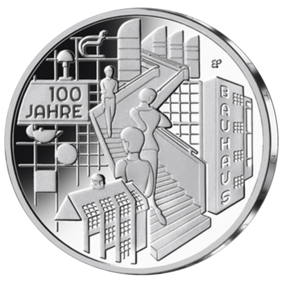 Немецкое правительство выпустило юбилейную серебрянную монету, разработанную берлинским художником Бастианом Приллвицем. Он взял за основу лестницу, окруженную зданиями Баухауса в Веймаре, Дессау и Берлине.