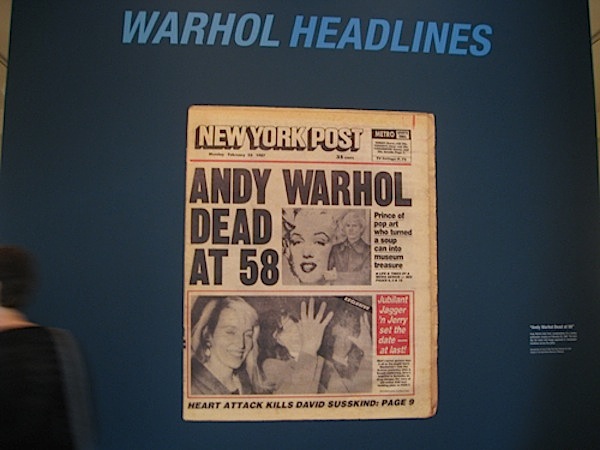 В настоящее время в Национальной галерее Вашингтона представлена уникальная коллекция работ незабвенного гения: десятки журнальных обложек и газетных первых полос, оформленных в свое время королем поп-арта, дают возможность ощутить то влияние, которое оказали масс-медиа на творчество Энди Уорхола. Выставка, объединившая более 80 работ Энди, продлится до 2 января 2012 года, после чего отправится в Музей современного искусства во Франкфурт, а затем — в Итальянский национальный музей современного искусства.