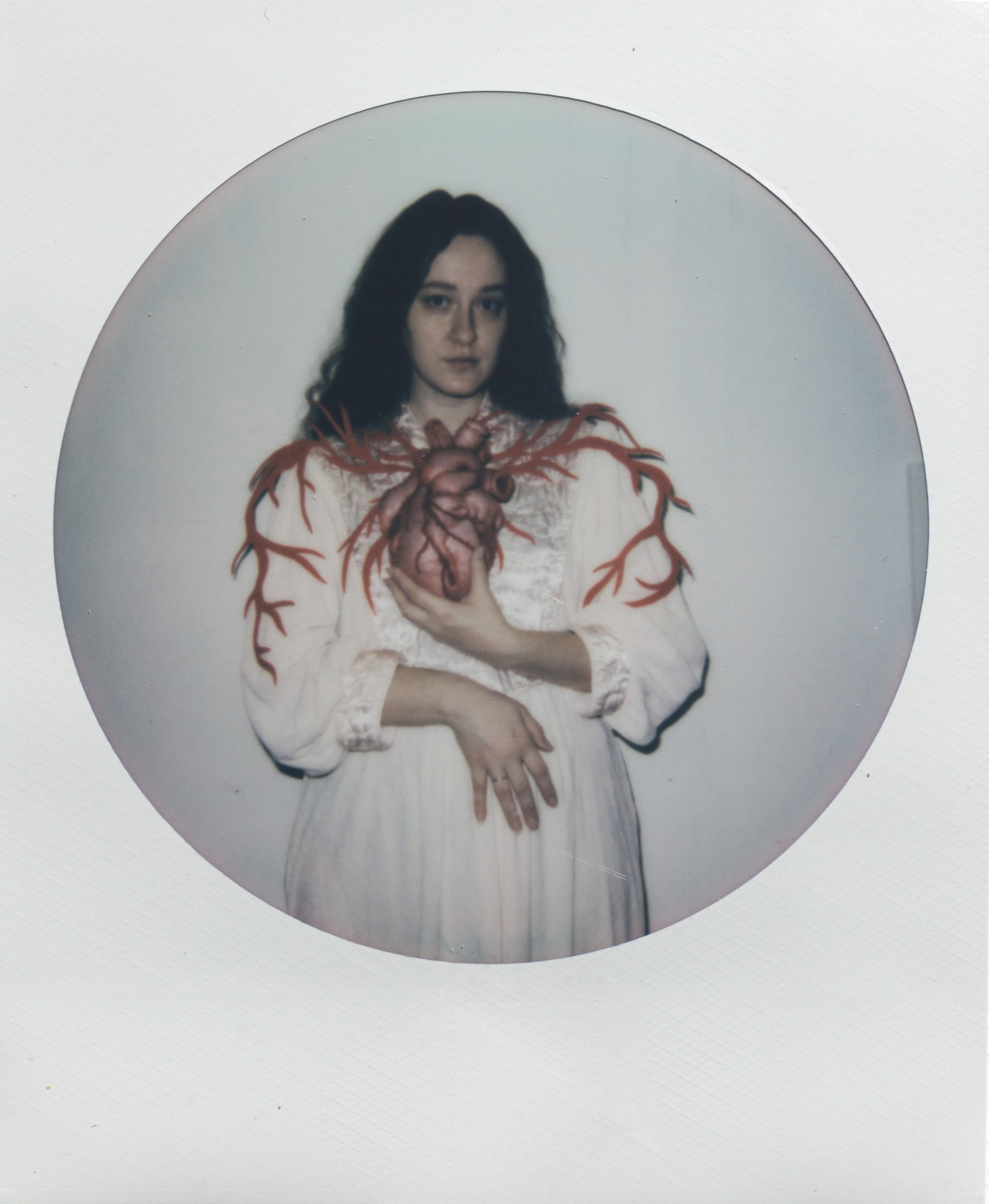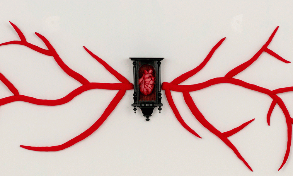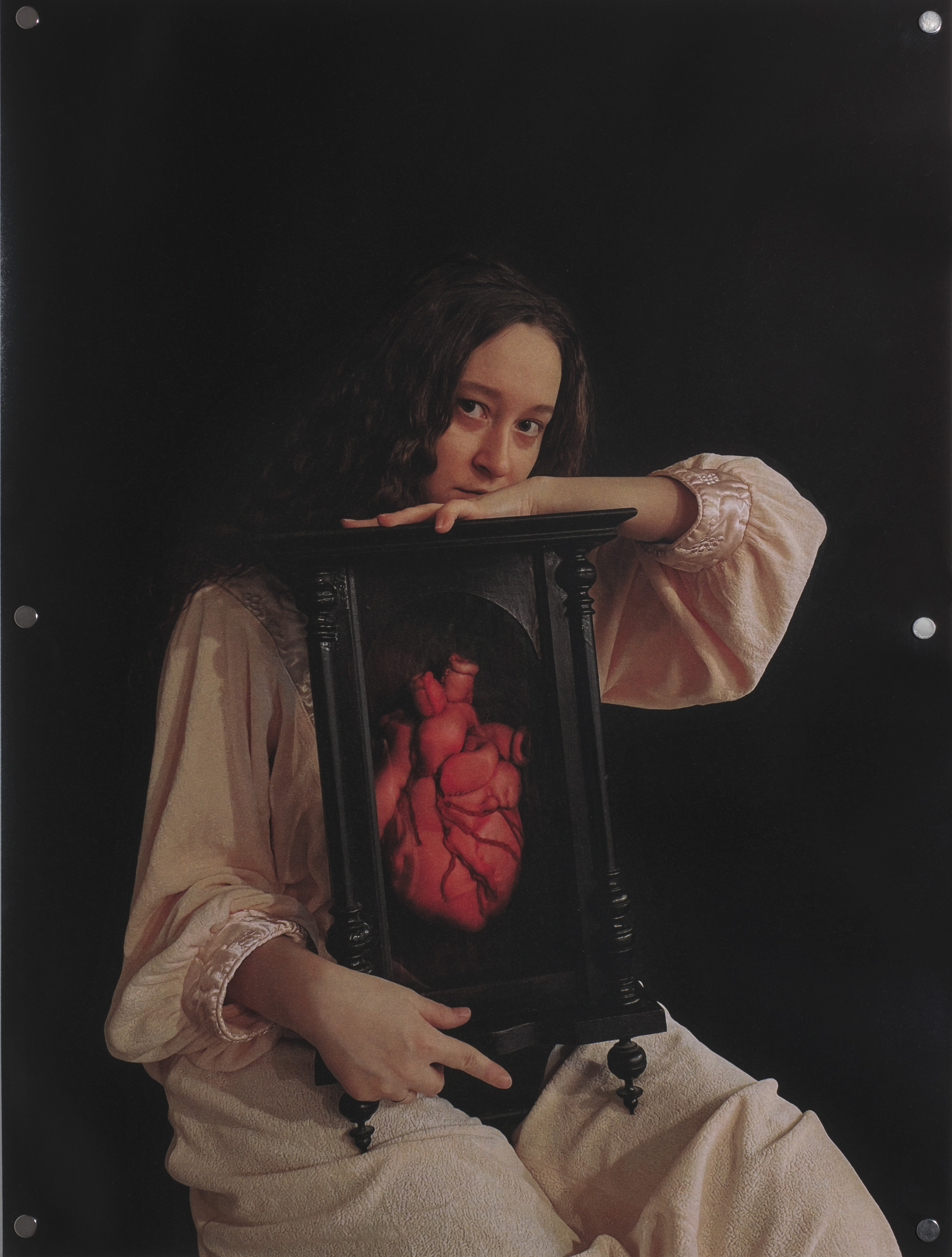 А теперь к вопросу о названии. Я люблю собирать различные старинные предметы, например старые наличники или рамы от советских зеркал. Все эти вещи я интегрирую в свое искусство. Недавно я начала собирать тагильские подносы и короба от старинных часов. Удивительно, но у многих людей до сих пор хранятся короба без часовых механизмов. Однажды я нашла очень красивый короб, у которого отлично сохранилась дверца со стеклом. Внутрь этого короба сразу захотелось поместить что-то хрупкое. Самое хрупкое, что у меня есть, — это мое сердце. Так появилась заглавная работа выставки — сердце в коробке, из которой вырастают огромные красные сосуды. Так у меня в голове возникла ассоциация с песней «Heart-Shaped Box», и я сразу определилась с названием. Оно отзывается во мне, как и человек, написавший эту песню.