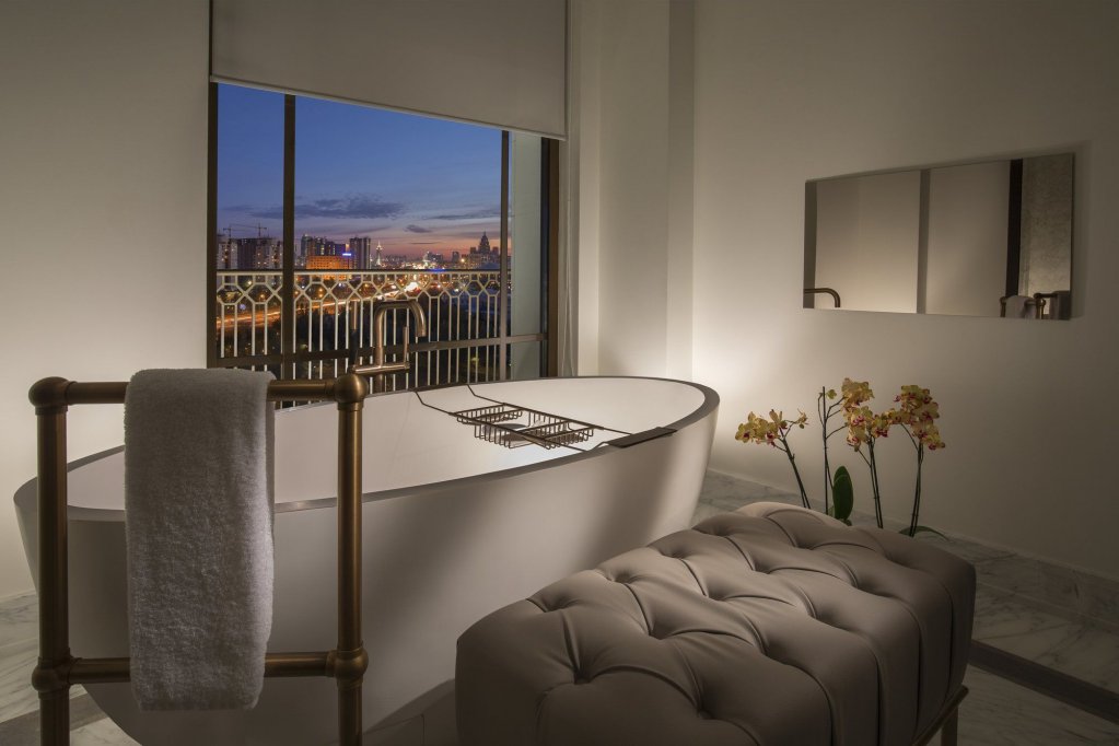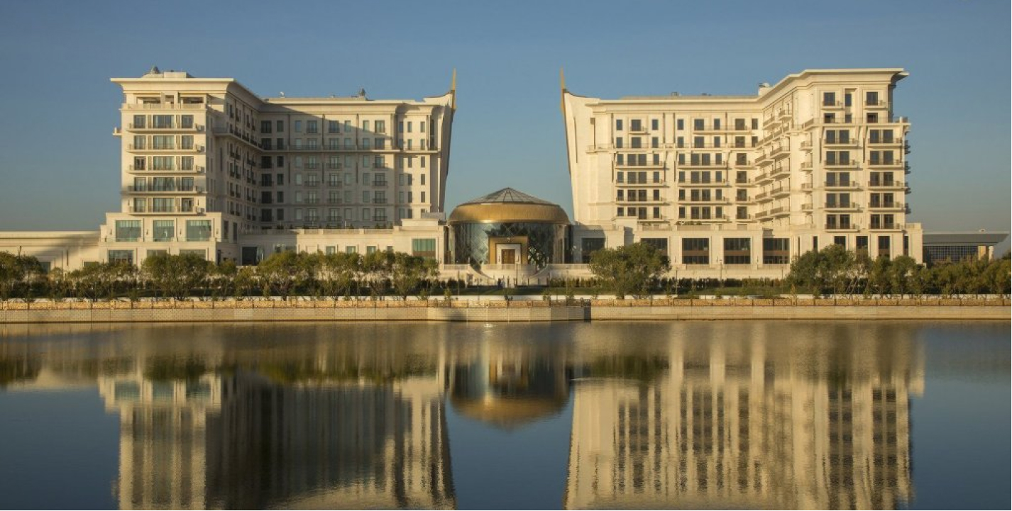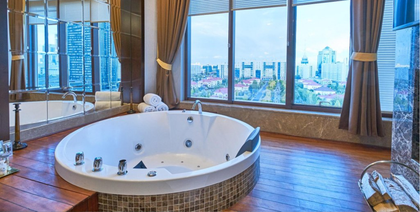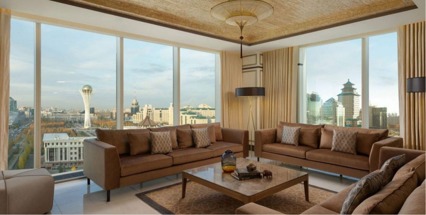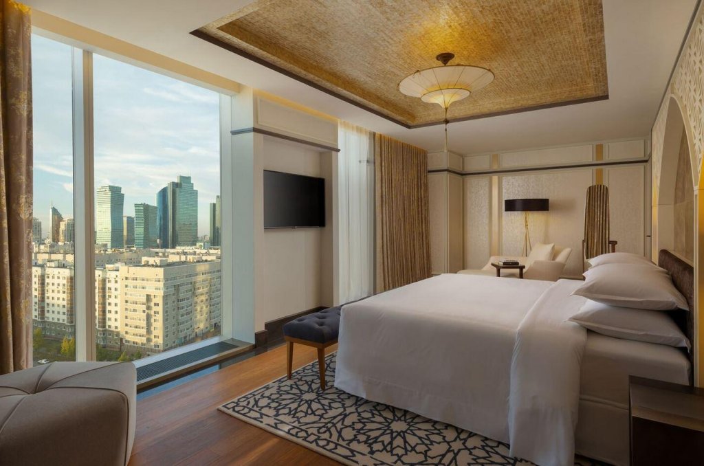 Когда хочется убежать от шума и суеты большого города — The St. Regis Astana находится прямо на территории Центрального парка Нур-Султана недалеко от реки Ишим. Отель привлекателен не только живописной локацией, но и дизайном номеров: кессонные потолки с геометрическим рисунком, цвет слоновой кости, изготовленная на заказ мебель, мраморная отделка ванной комнаты. Всего комнат 120, площадью от 68 до 510 квадратных метров.