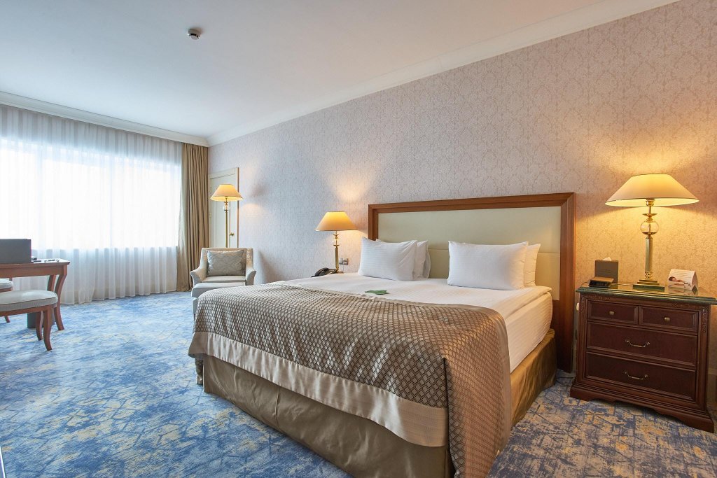 Номера здесь оформлены в восточном вкусе: много золота, мебель из дерева и яркие, но ненавязчивые предметы декора. Через панорамные окна открываются фотогеничные виды Нур-Султана, особенно эффектной картинка становится после захода солнца.
