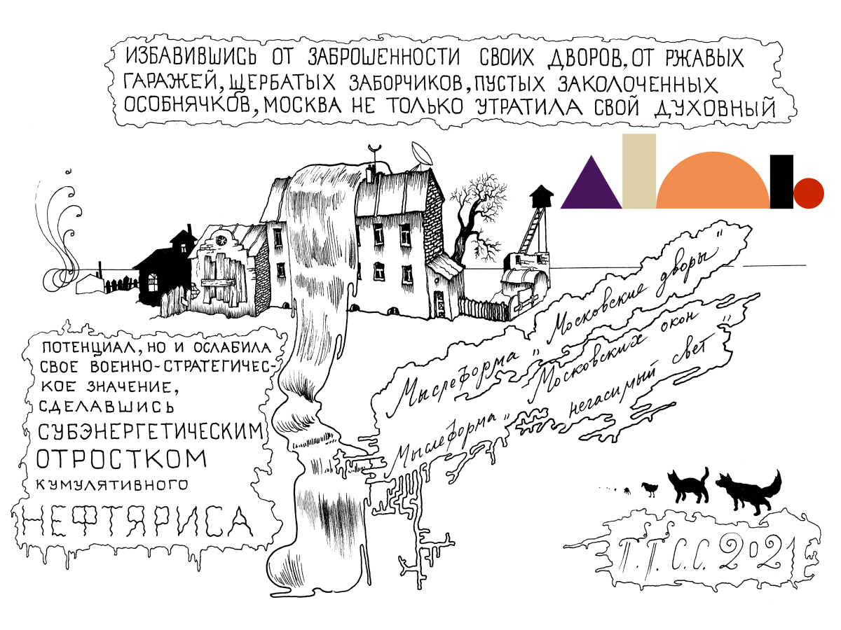 В нашей версии подсознание Москвы воплощено в образе гигантского нефтяного месторождения, залегающего глубоко под городом. Как и в случае планеты Солярис, описанной Лемом и Тарковским, оно обладает собственным сознанием и развитыми телепатическими способностями. Мы называем его Нефтярис. Так же как и Солярис, Нефтярис способен вкрадчиво проникать в наши воспоминания и создавать призраков, но, с другой стороны, мы и сами в некотором роде являемся призраками, созданными им. Что называется, доброй ночи, мои москвичи.