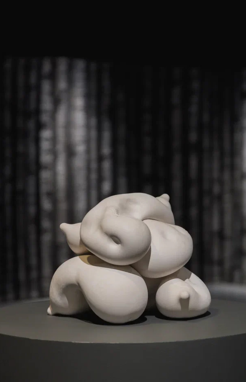Сексуальная, трогательная работа Анастасии Праховой расположена на втором этаже выставки New Now, где сталкиваются мужское и женское начало — жесткое маскулинное и текучее феминное. Художнице важно исследовать PARTS — части памяти, тела и сознания. Фрагментированное гипсовое тело объединено в гармоничную структуру. Объект легко пересобрать, словно пазл, но новые формы утратят изначальную красоту и слаженность. Вмешательсво в материал, создание уникальных отметин символизируют процесс исцеления после травматичного опыта и постепенного возвращения контроля.