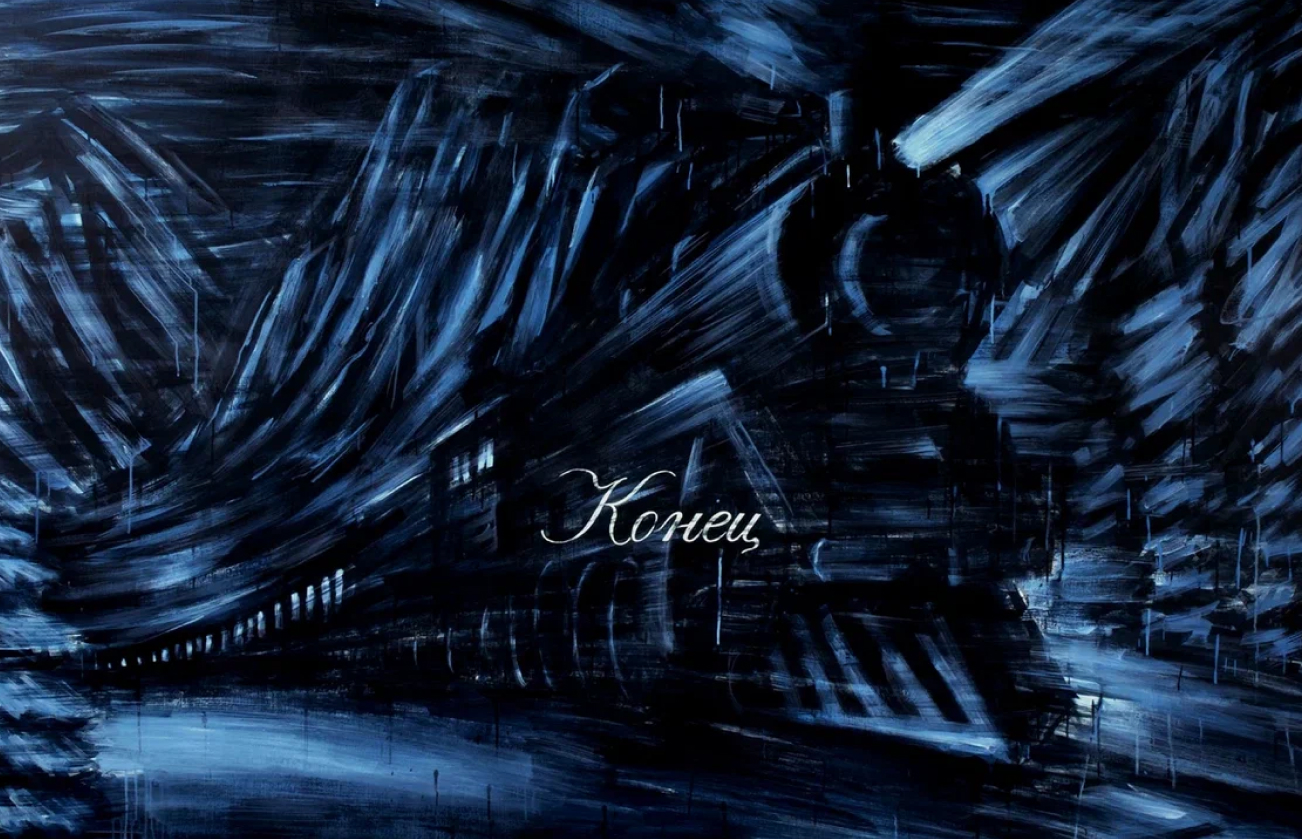 Картина в синих оттенках с изображением экспресса, мчащегося по зимней железной дороге, создает впечатление негатива старой кинопленки. Это придает работе атмосферу мистики и ностальгии, а символичная надпись «Конец» указывает на завершение определенного сценария. Автор приглашает порефлексировать и задуматься о прошлом — как мы пережили то, что когда-то казалось «концом»? Работа венчает выставку и одновременно является ее открытым финалом, оставляя возможность зрителю сделать самостоятельный выбор — остаться сторонним наблюдателем, пассажиром или машинистом на «стальном» пути жизни.