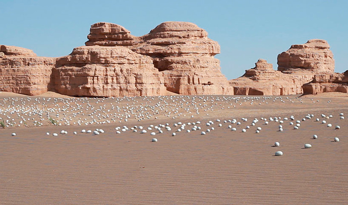 Художник Ши Шаопень украсил безлюдные участки Китая тремя тысячами керамических яиц — в рамках инсталляции "The Metamorphosis Series — The Eggs" он усыпал ими пустыню Гоби, песчаные дюны Дуньхуана, луги провинции Ганьсу и другие территории страны. Шаопеню понадобилось более года для того, чтобы изваять эти скульптуры. Каждое яйцо весит около 10 килограмм, а общая их масса достигает 48 тонн. Посмотреть на работу китайского художника сегодня можно на фотографиях, которые с 25 августа по 11 сентября представляет Today Art Museum в Пекине.