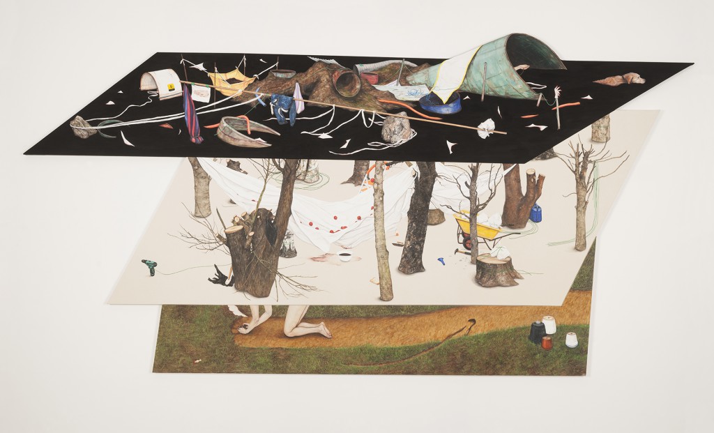 Параллельно со «Сменой декораций» в «Триумфе» покажут «Балансируя» — выставку работ южнокорейской художницы Ли Чинчжу. Ли работает в жанре субъективного реализма и психоландшафта, а ее работы — своя собственная реальность, в которой Чинчжу хочет избавить нас от «маркеров времени». Технически это традиционная корейская живопись: художница с помощью хлопка, красок и клея создает разные по сложности композиции и масштабам полотна. Свет, детали и размах — это первое, на что обращаешь внимание, когда смотришь на ее работы. А еще в «Триумфе» воссоздадут мастерскую Ли Чинчжу и покажут эскизы к работам и фотографии.