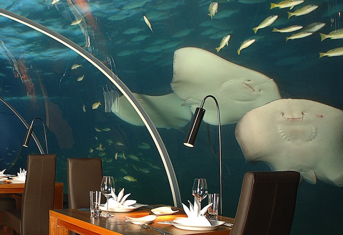 Подводное помещение ресторана размером 5х9 метров включает в себя 7 столиков и может вместить до 14 человек, а значит, о бронировании стоит позаботиться минимум за две недели до предполагаемого ужина.
