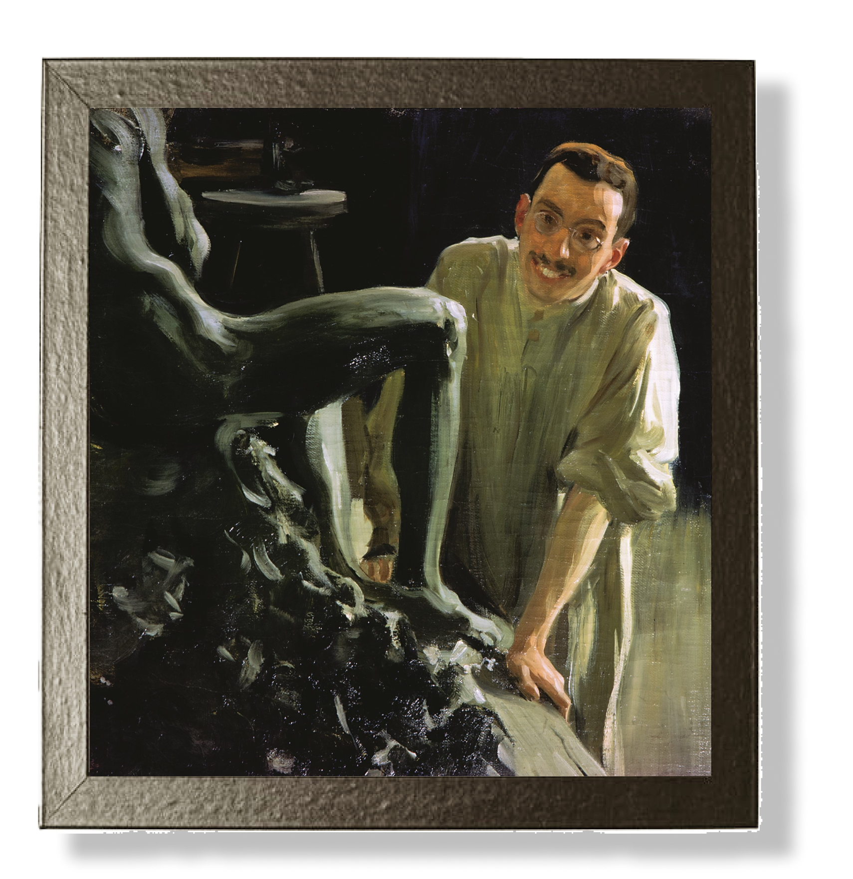 Борис Кустодиев и Дмитрий Стеллецкий дружили со времен учебы в Академии художеств и вместе исследовали русские города и европейские страны. Эта работа написана во время одной из поездок в Италию. Картина приковывает внимание широкой улыбкой, которая не характерна для портретов того времени. Здесь наблюдаем Дмитрия Стеллецкого в рабочем халате, он увлечен процессом и счастлив заниматься скульптурой. Картина больше напоминает дружеский шарж. Кустодиев изображает не только коллегу и товарища-скульптора, но и отождествляет Стеллецкого с делом его жизни.