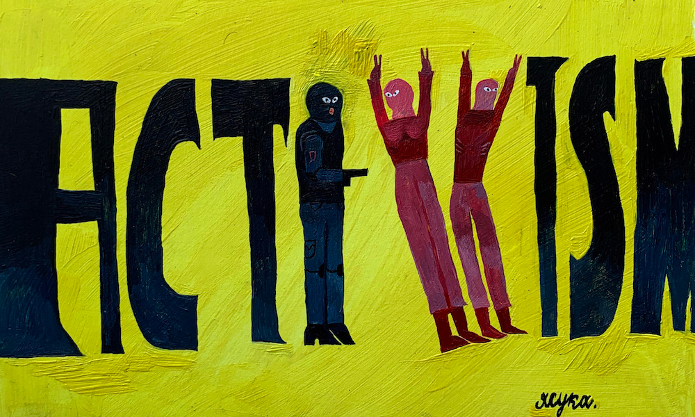 Молодой художник с окраины Москвы Рома 9сука (читается как «Я сука») пишет картины под этим псевдонимом еще с тех пор, как был граффитчиком. Рисует Рома с детства — отчасти по примеру отца-краснодеревщика, который сублимировал афганское прошлое в искусство. Сейчас художник создает критические работы про власть, полицейский режим в стране и культуру наркопотребления.