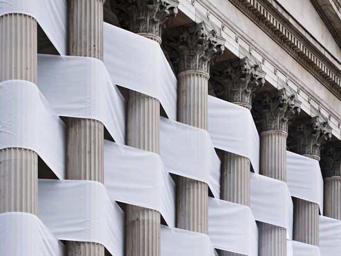 Николас Фельдмейер, современный британский художник, переплел колонны университетского колледжа Лондона (UCL) лентами из белой ткани. Он изменяет старые здания города, внося в их архитектуру "свежую струю" и преображая их с помощью контрастирующих материалов. Так, портик университетского колледжа заиграл по-новому благодаря четкому и графичному плетению из полос ткани.