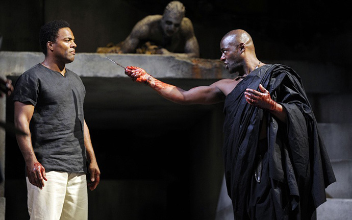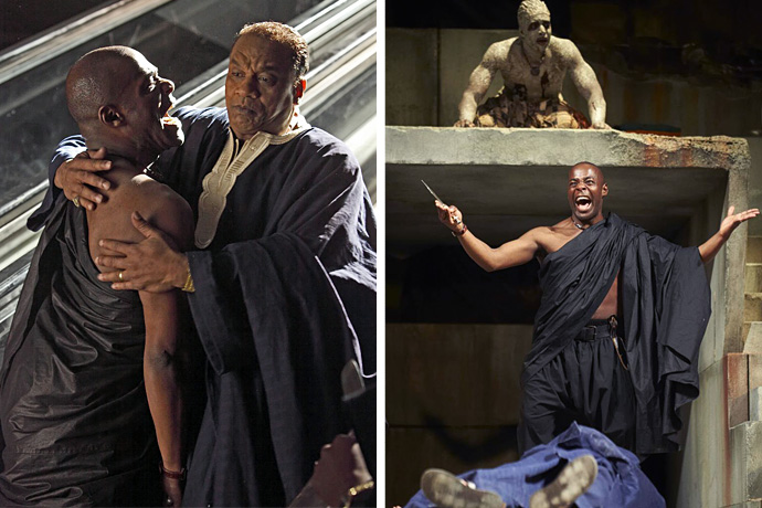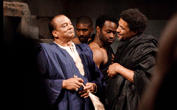 Своего рода дерзость в постановке этого великого "политического триллера" заключается в том, что сюжет "Юлия Цезаря" перенесли в современную Африку, а все роли в спектакле исполняют лучшие темнокожие британские актеры — Аджоа Андо, Рэй Фирон, Паттерсон Джозеф, Джеффри Киссун, Джозеф Майделл, Сирилл Нри и другие.
