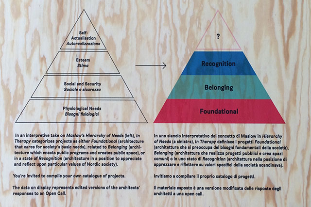 Павильон, которым на паритетных правах пользуются Финляндия, Норвегия и Швеция, — беспроигрышное направление на любой биеннале. В этом году здесь представлен In Therapy — сеанс психоанализа нордического общества через призму архитектуры. Почти триста самых разных проектов из трех стран ранжированы в соответствии с пирамидой потребностей Абрахама Маслоу, подобие которой выстроено посреди павильона, а устроившись на кушетке перед одним из телевизоров здесь же можно посмотреть интервью с ведущими скандинавскими архитекторами, размышляющими о ценностях своей профессии и социальной роли архитектуры.