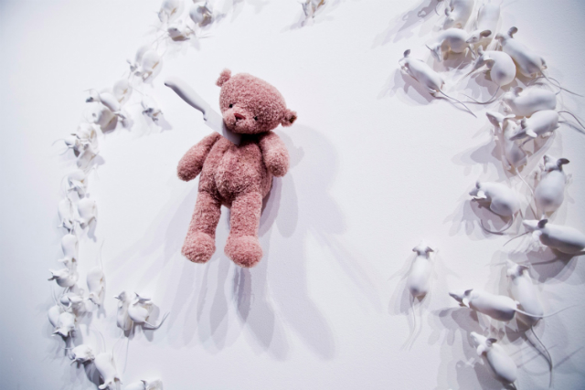 Pechersky Gallery привезла в Москву американскую художницу Рэйчел Ли Ховнэниан. Выставка, камерно разместившаяся в трех залах галереи, посвящена засилью гаджетов в повседневной жизни. Часто социальные сети заменяют живое общение, даже когда люди сидят за одним столом. Художница утрирует этот сюжет. В выставочном зале поместили свадебный стол: жених и невеста сидят друг напротив друга, увлеченно орудуя смартфонами. Пока парочка собирает лайки и комментарии, белоснежную пирамидку праздничного торта поедает прожорливая мышь — не живая, конечно. По задумке художницы, мышь символизирует прыткий научно-технический прогресс. А вечные ценности: душевность и человечность — обретают форму миловидных плюшевых мишек, одного из которых повесили, другого — жестокосердо пырнули ножом. Зверушек, кстати, специально разместили на определенном уровне — чтобы удобно было снимать селфи. Нашлось место и видеоарту: на кровати в сумраке предполагаемой спальни копашатся парочки с телефонами в руках, тщетно пытаясь устроиться поудобнее и заснуть: людям и гаджетам явно становится тесно.