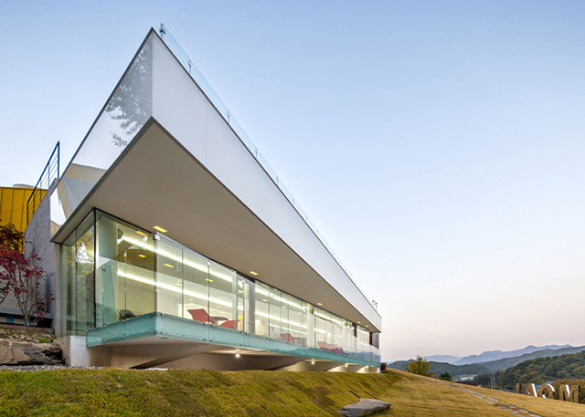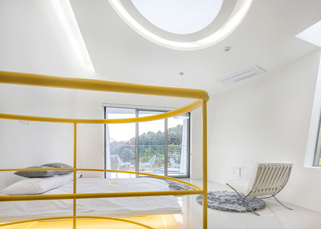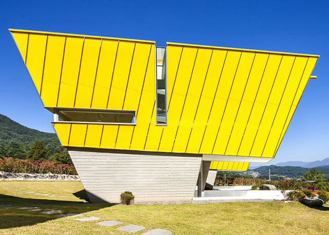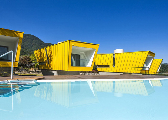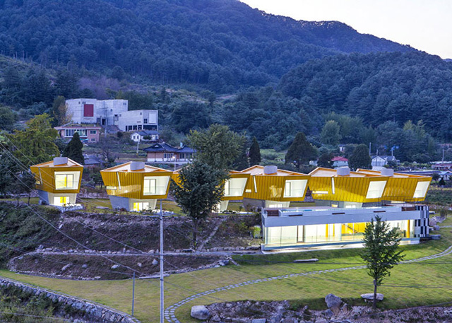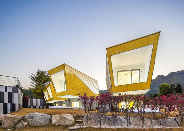 Каждое из шести зданий представляет собой асимметричную конструкцию ярко-желтого цвета. Над небольшими бетонными фундаментами, также выполняющими роль гостиных, возвышаются расширяющиеся от самого основания секции домиков, больше напоминающие детали какого-то детского конструктора или элементы мозаики. Желтый цвет панелей фасадов игриво перекликается с окружающим зеленым ландшафтом, возбуждая воображение путника, направляющегося в сады Gapyeong County.