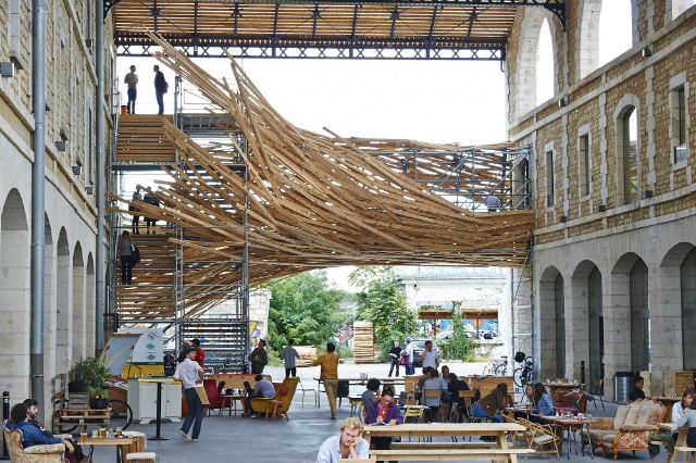 Французам не откажешь в умении красиво и креативно жить: на днях надземный переход между двумя зданиями в городе Бордо обзавелся привлекательным украшением — инсталляцией Vortex ("Воронка") от бюро 1024 architecture. Из одного корпуса постройки в другой врывается всполох древесных лучей, спрятавших за собой пешеходный мостик. Днем конструкция выглядит как исполинский букет из веток, зато ночью начинает играть яркими цветами, превращаясь в аудиовизуальную инсталляцию.