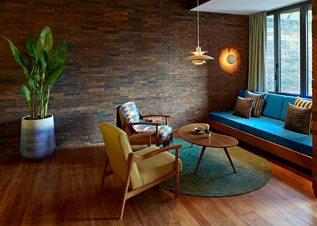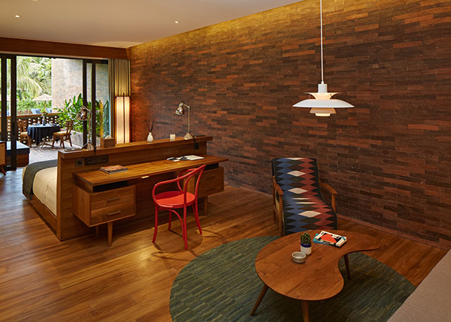 За дизайн внутри здания отвечала сингапурская студия Takenouchi Webb, которая тоже решила сделать доминирующими материалами местные кирпич и дерево. Помимо этого, в интерьере использованы винтажные предметы мебели из собственной коллекции хозяев отеля, а также кресла и стулья, созданные датскими дизайнерами Хансом Вегнером и Арне Якобсеном еще в середине прошлого века. За текстиль и керамику отвечали балийские мастера. Например, ковры были сотканы и окрашены вручную работниками местной студии Tarum.