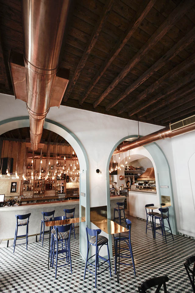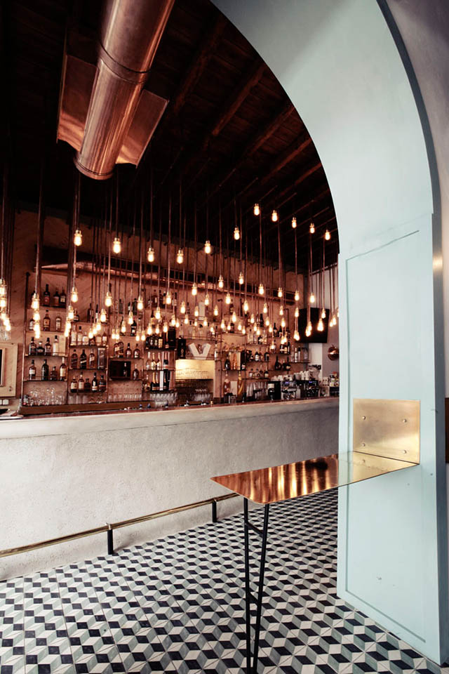 Не затронув белые стены, колоритную обивку мебели и черно-белую плитку на полу, отсылающие к национальным традициям острова, дизайнеры постарались привнести немного свежести в исторический декор. Фасад украсили современные вывески, над баром появились десятки висячих лампочек, фабричные трубы под потолком покрылись медью, а о прежнем назначении пространства напоминают лишь бетонные стены коридора и барная стойка, повторяющие своей структурой морскую губку.
