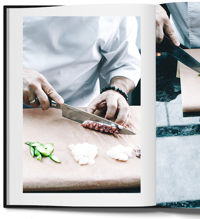 Сервировка: в Sixty кинотто с морепродуктами подают на плоском, каменном блюде (хотя это попросту сервировочная доска) - стоит отметить, смотрится неплохо. Однако, в конце концов, главное - вкус, которого этому блюду не занимать. Поэтому выкладывайте в глубокую тарелку, посыпайте кресс-салатом и пробуйте.