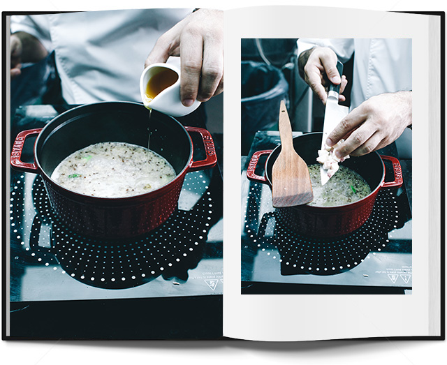 Что нам понадобится: спаржа зеленая (отварная) — 30 гр, киноа (отварная) — 200 гр, масло острое (пепперончино) — 1/2 чайной ложки, масло сливочное — 25 гр, морской гребешок — 25 гр, кальмары мини — 25 гр, мидии (отварные) — 10 гр, щупальца осьминога (отварные) — 25 гр, куриный бульон — 200 мл, соль — 2 гр, перец — 1 гр, кресс-салат — 3 гр, тархун (трава) — 2 гр.