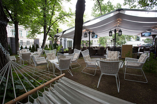 Черепичная крыша и зеленые туи — атмосферу дополняет расслабляющая lounge-музыка. Гостей с комфортом разместят в уютных креслах, прохладным вечером можно укутаться в теплый шерстяной плед. Веранда работает круглосуточно.