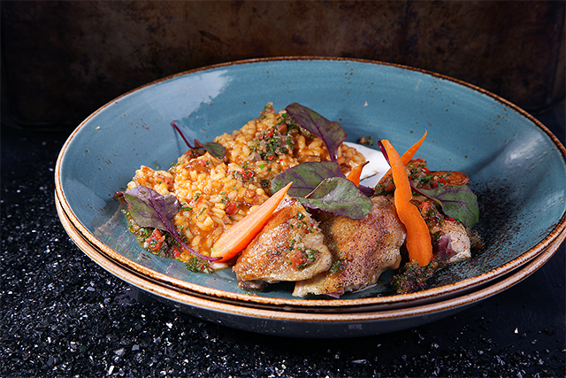 Традиционная кошинья — это жаренные во фритюре пирожки грушевидной формы из смеси картофеля и маниока с начинкой из курицы. Валентин делает их с уткой и кремом из сметаны с сыром (350 руб.). Получается довольно сочная бомбочка, не скрывающая легкой панировкой сладковатого вкуса утки. Галиньяда (750 руб.) — это цыпленок с рисом, приготовленным средним между ризотто и паэльей способом. Мокека из сезонной рыбы с кокосовой пеной и фарофой из дэнде (800 руб.) — парафраз на тему готовившегося в горшках индейского супа-рагу с кокосовым молоком. Фарофа — отдельная и самая трудноартикулируемая тема бразильской кухни. По сути, это жареная мука, что-то вроде кускуса. Она отлично впитывает жидкость и потому незаменима в качестве сопровождения к блюдам вроде стейков. К мокеке Валентин делает фарофу из пальмовой муки, а самую классическую, из маниока, подает вместе с хрустящими рисовыми шариками с копченостями и томатным конкассе к стейкам — пиканье (1500 руб.) и стриплойну (2100 руб.).