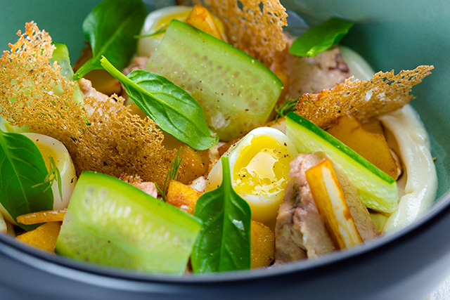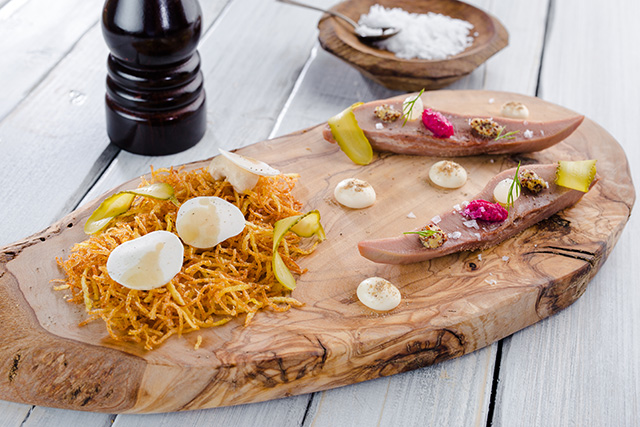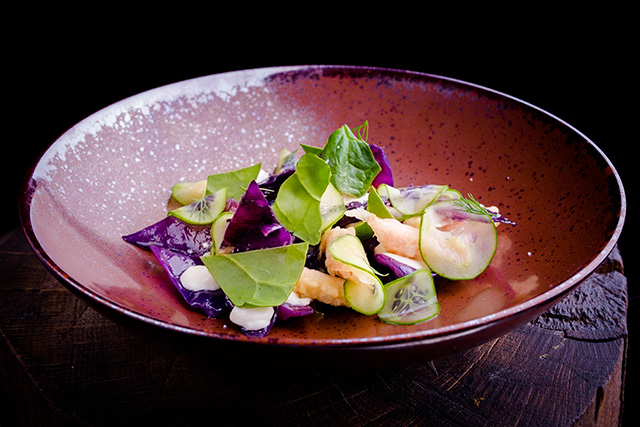 Делать это стоит уже потому, что Троян — энтузиаст донельзя. Увлекаясь, он допускает огрехи в презентации блюд, но никогда не жертвует вкусом. Из овощных очисток, вершков и корешков он, в полном соответствии с французской школой, редуцирует соусы почти карамельного свойства. Его текущее увлечение — хрустящие текстуры в контрасте с мягкими. Вареное яйцо — идеальное блюдо для воскресного завтрака — он подает в панировке с воздушной пеной из грибов и картофельной соломкой (490 руб.). На грубой деревянной тарелке это смотрится деревенским инь и ян, воплощением сельского вкуса России. Пикантный острый вкус и аромат пены из хрена, подаваемой с маринованным мурманским лососем (850 руб.) и губкой из блинного теста, сглаживает домашний творог. Тартар из фермерской говядины (780 руб.) похож на весеннюю лужайку: тут вам и травка, тут вам и коровка. Салат с камчатским крабом (980 руб.) превращается в иллюстрацию российско-японских отношений. Сам краб обжаривается в рисовой темпуре и в таком виде сильно напоминает мягкопанцирного собрата, а предварительно тушенная в сувиде и обжаренная краснокочанная капуста придает блюду мягкую горчинку.