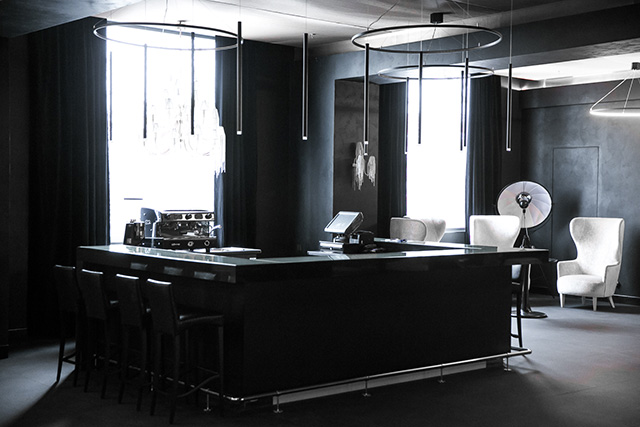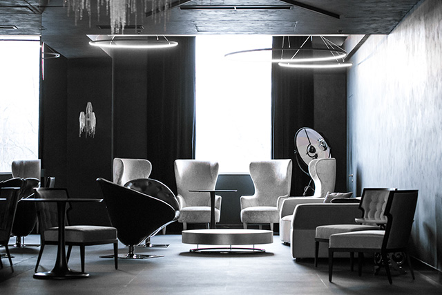 Как известно, театр начинается с вешалки — гостям «Ленинград Центра» ее подадут милые дамы в перчатках и пиджаках Chanel. Глянцевый полумрак холла балансирует между лоском культурного центра и китчем центра развлекательного, избегая последнего благодаря вниманию к деталям и предельной продуманности. Черное и темно-синее оформление с броскими золотыми сетками-светильниками, красными диванами и креслами — почти потусторонние интерьеры из сериала «Твин Пикс» Дэвида Линча. Отсюда можно пройти в два бара, расположившиеся по обе стороны театрального зала: черный — немного поблескивающий гламур 2000-х с удобной современной интимностью — вышло приятно и атмосферно; и белый — лаундж-зона, вариант музыкальной гостиной с роялем, здесь можно отставить бокал с горячительным и взяться за чашечку кофе. Во время театральных антрактов бары становятся альтернативой театральным кулуарам и буфетам. Главное ноу-хау — самая большая в Европе медиастена, смонтированная из 99 экранов. Одна минута видео — это 24 часа работы. Раздвигаясь, эта стена открывает вход в театральный зал.