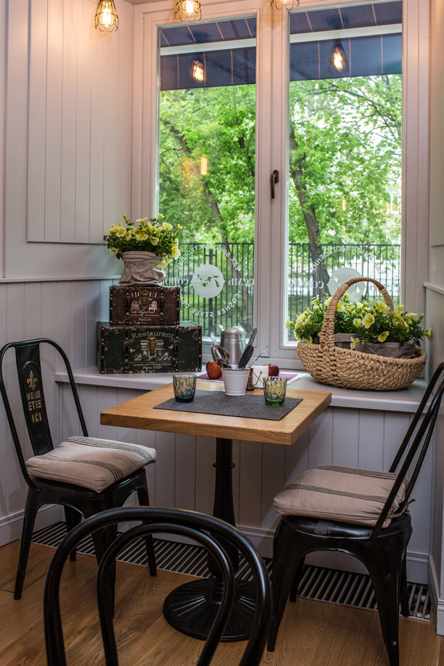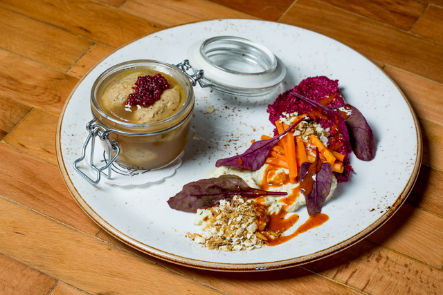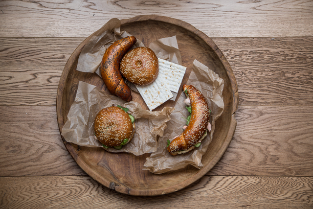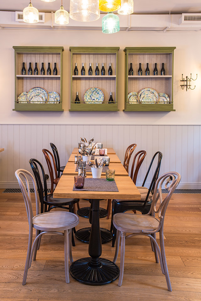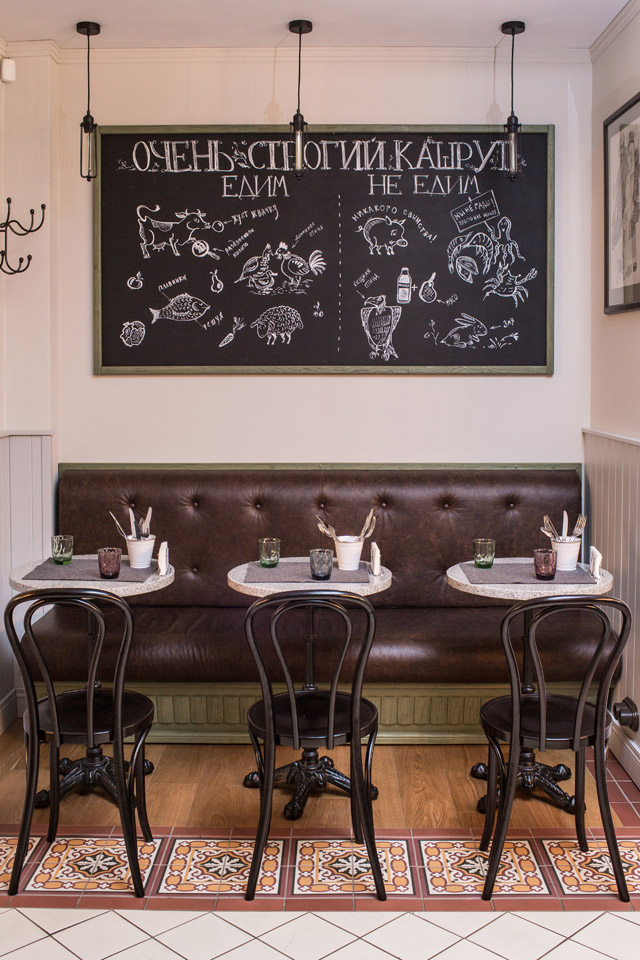 Дверь между театром на Малой Бронной и бутиком переоцененных платьев A La Russe — та самая, что вам нужна, с узкого тротуара в спешке ее можно и не заметить. В названии новой точки на гастрономической карте Патриарших каждый волен ставить ударение на ту «о», которая ему понравится. И это сразу снимает все вопросы. Хотите — пританцовывайте в ритме всем известной клезмерской мелодии, хотите — рисуйте на тарелках сорок, их потом выставят в зале, чтобы все полюбовались вашими художествами. Свежий и простой интерьер наполняет небольшое в общем-то помещение воздухом и как-то ловко решает вопрос тесноты. На меловой доске рисунками доходчиво и ясно изложены принципы кашрута, так что даже неспециалистам становится понятно, что в здешних блюдах не найдется свинины, крольчатины, хищной птицы, сочетаний мяса и молока и рыбы без чешуи и плавников. Вполне понятно желание сделать еврейскую кухню интересной для широких масс, а не только для «целевой аудитории», особенно при наличии синагоги за углом.