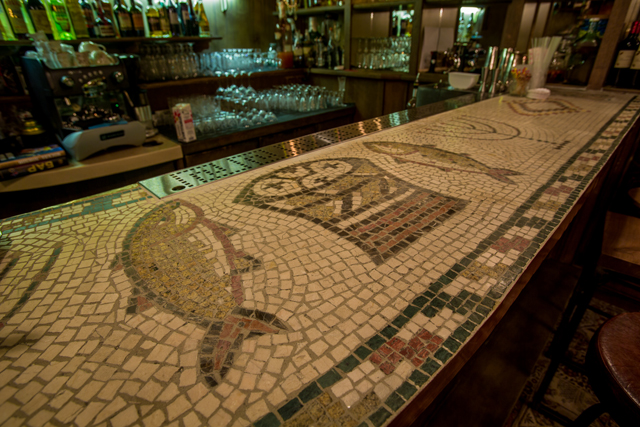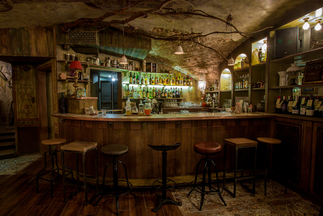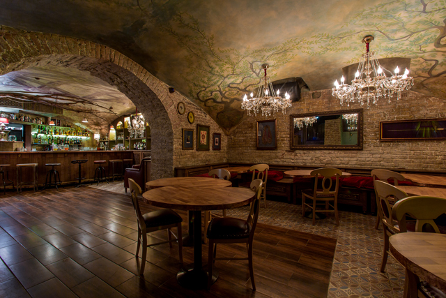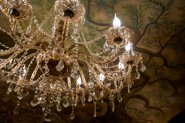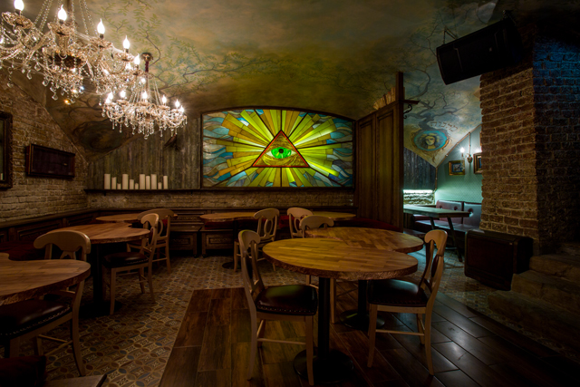 Найти это концептуальное тематическое заведение на туристической улице непросто: вывески как таковой нет. Вход в арке справа от ресторана северной кухни Bjorn отмечен синей звездой и табличкой с написанным на иврите мелом названием. За дверью с оконцем — крутой спуск в подвал, обвитый корнями деревьев. Внутри полумрак и мистицизм в полный рост. Хрустальные люстры, каббалистические знаки, масонские символы, украшенная буквой «Алеф» диджейская стойка. Весь этот сюрреализм — дело рук театрального художника-декоратора Андрея Павленко. Смотрится перегружено, тем скорее хочется перевести взгляд в тарелку, благо, ставят их на неожиданно современные столики-бобы из старинного букового паркета: их удобно соединять друг с другом для больших компаний. Такие тут действительно бывают. Среди здешних посетителей — и иудейские активисты, и словоохотливые еврейские бабушки, и богемная молодежь, и масоны Великой ложи России.