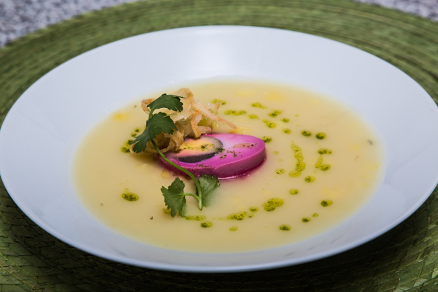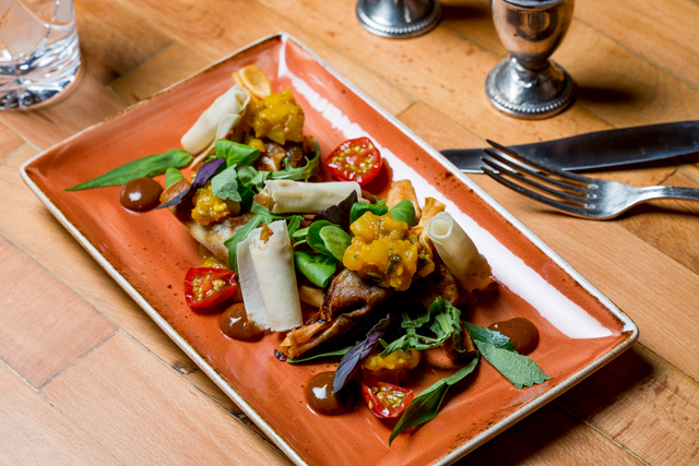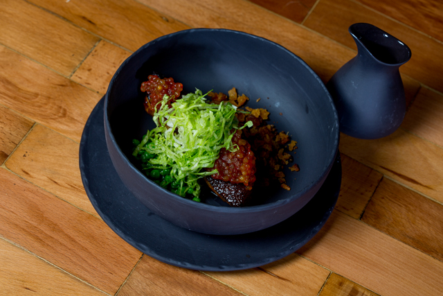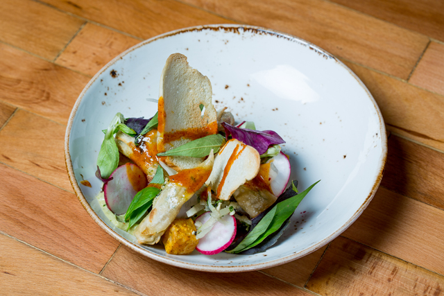Столь эксцентричный микс вполне вписывается в концепцию гастробара, в кухне которого есть место и ягелю, и красной икре, и кнейдлах, и черной треске, и таджину, и хойсину. Шеф-повар Евгений Бедненко эту невероятную смесь объясняет тысячелетними скитаниями еврейского народа по всему миру, а преобладающий в его блюдах сладко-пряный вкус тем, что «сладкий вкус всегда сопровождает в еврейской кухне решение любой проблемы». Такое получается приторное еврейское счастье. В здешней еде много эклектики и излишне сложных решений. Простые в общем-то блюда кухни не знавшего покоя народа перепридуманы так, что иначе чем еврейским фьюжен их и не назовешь. Фалафели из фенхеля с хацелимом, пряными тостами и напоминающим чатни домашним лечо (380 руб.), фалафели из золотого карпа (по сути фрикадельки из рыбы) с джемом из томатных косточек, яйцом пашот и красной икрой (400 руб.), индейка с кенийской фасолью, засахаренной красной смородиной, вяленой сливой под соусом хойсин (580 руб.), эсик-флейш из оленины с тамариндом, цимесом, пряниками и корнем земляной груши (880 руб.), черная треска, копченная на яблочных опилках, с томатной тапиокой, цукини и конфитюром из свежих помидоров (980 руб.) — только от перечисления этих блюд накатывает приторная волна. Глотком свежести смотрятся на этом фоне хумус с бараниной и йеменским схугом (подобие аджики, 520 руб.) и рваная паста с жареными куриными гребешками (590 руб.). Бедненко использует изощренные техники обработки продуктов, чтобы обогатить свои блюда игрой текстур, структур и вкусов, но это не приводит к искомому результату. Переусложненная еда слипается в гигантский переслащенный ком, с которым справиться могут только пара коктейлей. Например, MesibaAviv, в котором весьма удачно смешаны бурбон на вишне и французский вермут.