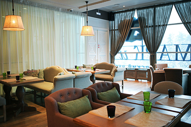 Написанный в наивном лубочном стиле лев осеняет зал, оформленный в дачно-деревенском стиле: льны и хлопки, дощатая обшивка бара, самовары на полках — это все про «русское раздолье».
