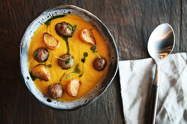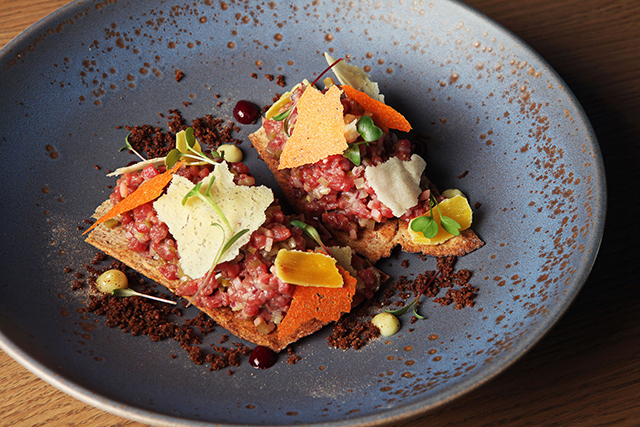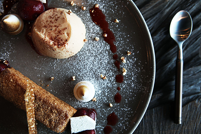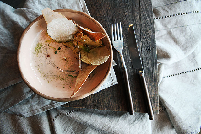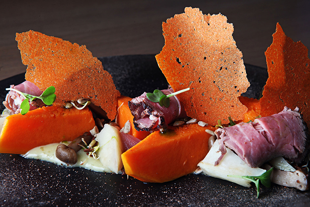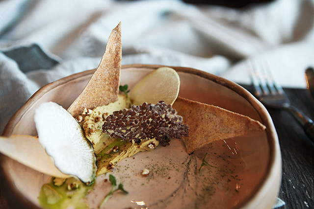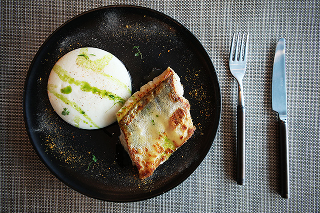 Зола из зеленого и репчатого лука приправляет говяжью вырезку, которая подается с печеной репой, пюре из пастернака, жареной черемшой и свежим редисом (900 руб.). Это как раз тот случай, когда короля делает свита: корнеплоды и овощи тут едва ли не интереснее мяса. Довольно прямой и узнаваемый вкус крем-супа из репы (340 руб.) сдобрен яркой, пряной, взрывной фрикаделькой из цесарки.