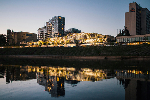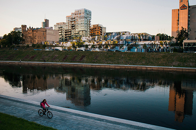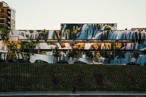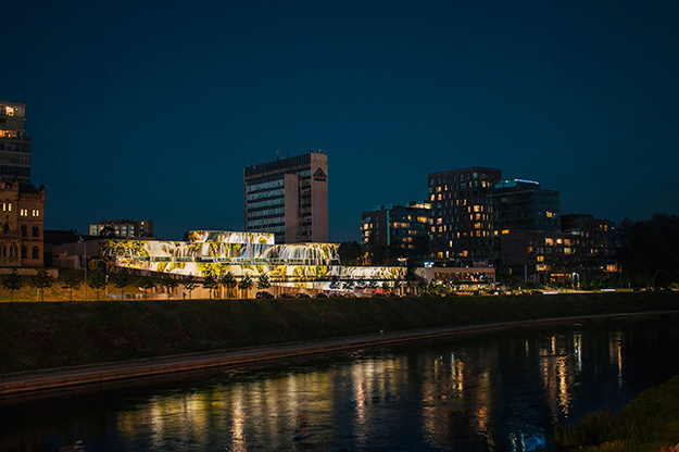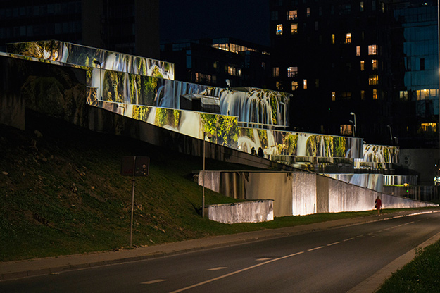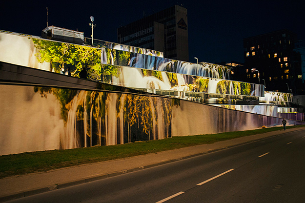 Благодаря Лукаускасу, ничем не примечательный гараж литовского парламента на берегу реки Нерис попал в новостные ленты ведущих изданий по дизайну. Исследуя влияния уличного искусства на жизнь города и городской пейзаж в целом, архитектор предложил использовать многоярусную постройку в центре Вильнюса в качестве большого панно. В итоге на 2 000 квадратных метров разместилось реалистичное изображение водопада в окружении деревьев. Прекрасный пример того, как можно превратить серый советский конструктивизм в объект современного дизайна.