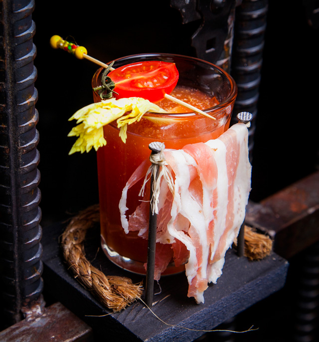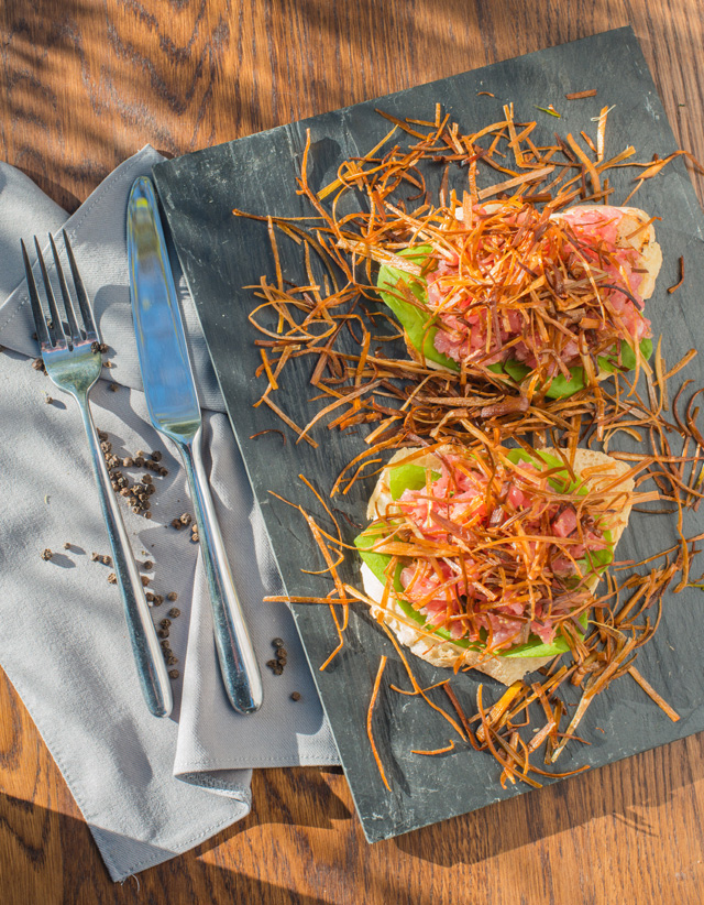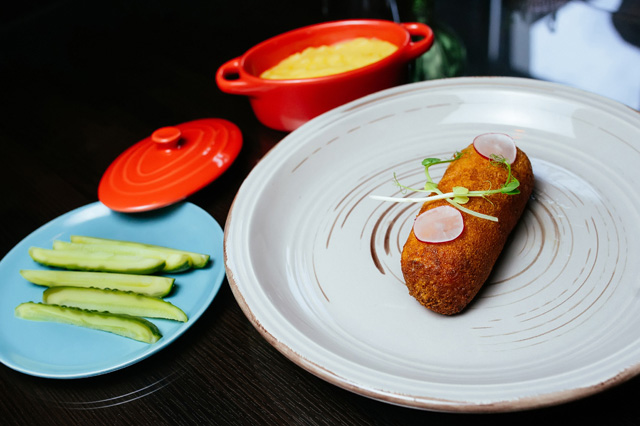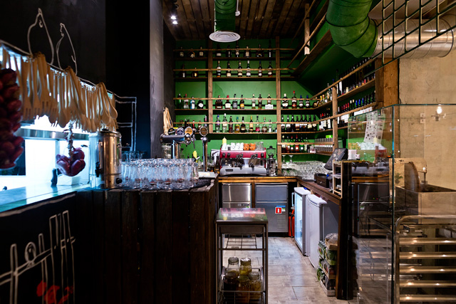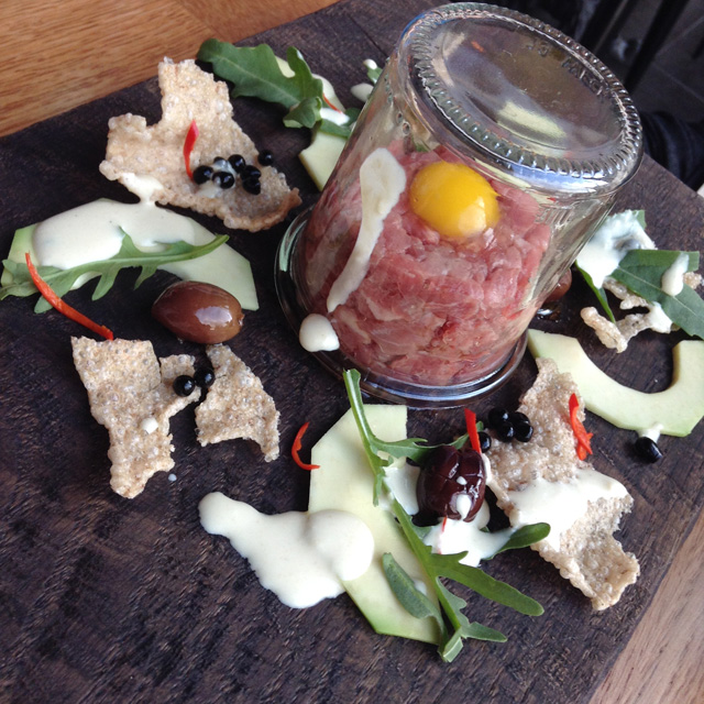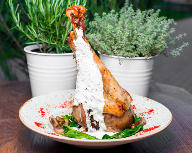 Бурно разыгравшаяся фантазия владельца кафе и по совместительству бренд-шефа Максима Горячева сделала реальностью стриплойн из фермерской мраморной говядины (1 228 руб.) на виселице. Мясо подают подвешенным за крючки на деревянной перекладине, резать его полагается хирургическими ножницами. Сок, понятное дело, скапливается в нижней части стейка и грозит забрызгать увлеченных театрализованным процессом едоков. Конкурентом подвешенного стейка по части «вау-эффекта» служит огромная запеченная нога индейки в горчично-медовом соусе с гарниром из молодой стручковой фасоли (688 руб.) — это уже, без шуток, большая удача. К ним можно отнести еще ассорти сала из Рязанской области (548 руб.), брускетту на гречневом хлебе с тунцом, авокадо, горчично-медовым соусом и хрустящей стружкой лука-порея (558 руб.), маринованную в киви баранину, нанизанную на шпажки с кусочками кольраби вместо сала (598 руб.).
