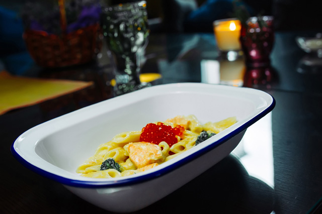 Дружественные Константиновой шефы подарили ее кухне свои рецепты: лазанья с потрошками (690 руб.) от Марко Якетты (ресторан La Scarpetta), котлета по-киевски (810 руб.) от Александра Погодаева (Cafe 21), пенне с семгой, брокколи и красной икрой (710 руб.) от Давиде Корсо (Bosco Café), «Бурбон Черри Тирамису» (360 руб.) от Дмитрия Зотова (Zotman Pizza Pie). Жест доброй воли можно оценить, но он не помогает заведению обрести свое лицо. Все здесь просто, без затей, добротно настолько, чтобы восполнить потерю сил загнанного в азартной погоне за победой организма. Собственного шефа ресторатор не афиширует — и поступает вполне разумно: гордиться ему нечем. Ни переваренной пастой, ни теплой окрошкой, ни грубовато исполненными тапасами, ни фирменным десертом из печенья, сливок, зефира и фруктов.