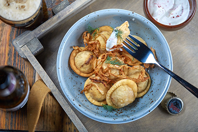 Столы с разнокалиберными стульями и креслами расставлены вокруг кухни-острова, занимающей центр зала. Ее особенность — гриль-роти, известный своей способностью одаривать продукты фантастической хрустящей корочкой. С его вертелов снимают утку, курицу и поркетту. Именно их и стоит пробовать в первую очередь. Утка (170 руб./100 г) подается с клюквенным соусом, а поркетта (850 руб.) с ароматной начинкой из чеснока, тимьяна и петрушки ничем не уступает итальянским родичам. Никогда не бывавший в Азии, Благовещенский наделяет свои версии простой и быстрой уличной еды такими верными вкусовыми акцентами, словно провел там полжизни. Севиче из нерки он рифмует с битыми огурцами (580 руб.), крупно нарубленный тартар из говядины (600 руб.) с кремом юдзу предлагает накладывать на обожженные грилем половинки круассана, пельмени с ростовской рыбой, сомом и судаком отдает в соусе том-ям (390 руб.), чью острую природу сглаживают свежесть кинзы и кислинка лайма. Сом с обжаренной капустой кимчи (780 руб.) и сметаной, фантастические — не оторваться! — копченые свиные уши в темпуре (320 руб.), жареная кровяная колбаса с тушеной квашеной капустой и картофельным пюре, в которое добавлена жареная свиная кровь (480 руб.) — все это так оглушительно, что не выдержит никакого винного сопровождения. Именно поэтому в Funky Food акцент делают на пиво и сидры. Они и вправду отлично подходят к благовещенским версиям стрит-фуда.
