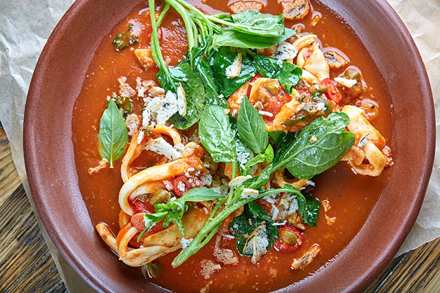 Сытно, мощно, без финтифлюшек — Благовещенский не скрывает своей любви к простой и обильной еде. В B.I.G.G.I.E. он готовит рафинированную версию своей любимой ростовской кухни, укрощая ее избыточность и чудесную расточительность. В Funky Food он и не думает себя сдерживать. Это место — его дитя, к которому он относится с нежностью и трепетом. Его авторству принадлежит не только меню, но и интерьер. В нем причудливо сплелись панк-инфантилизм, граффити в стиле Бэнкси и элементы промышленного винтажа. Один только жидкий пол (натурально, жидкий) в уборных чего стоит.