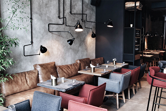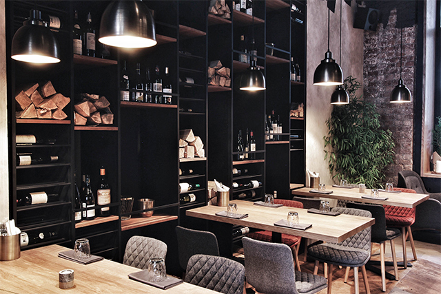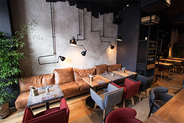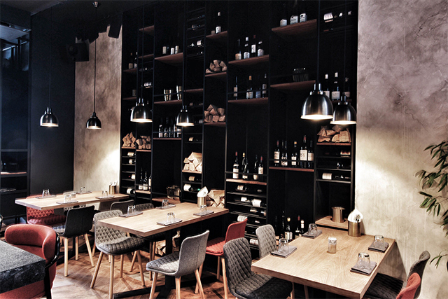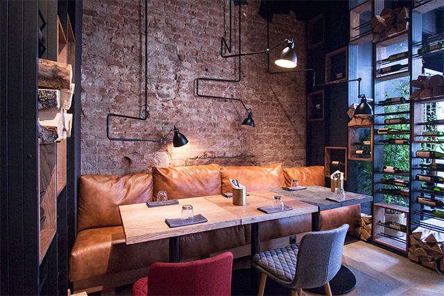 Гостеприимно и рационально расположенные «очаги» не ограничиваются хоспером и баром. В уютном уголке спрятан небольшой камин, а множество источников света создают на фоне матово-черных и каменных поверхностей интерьера иллюзию ночного неба. Барочная Пантелеймоновская церковь с белыми тосканскими пилястрами во весь рост встает за окном, практически четвертой стеной в ресторане — и лучший декор уже вряд ли можно придумать.