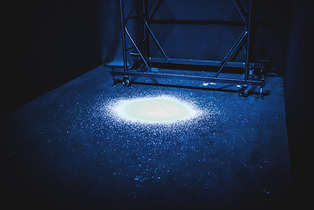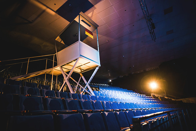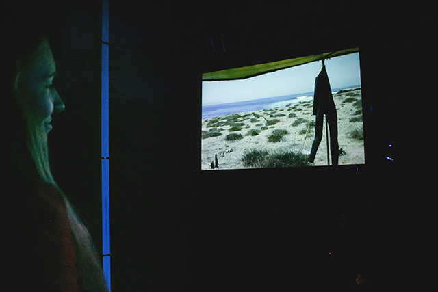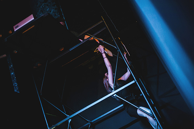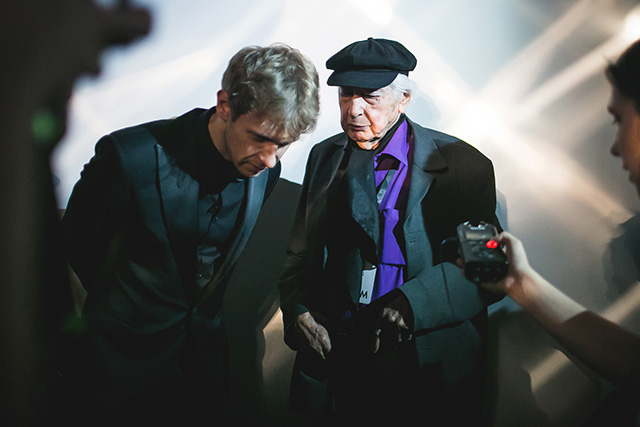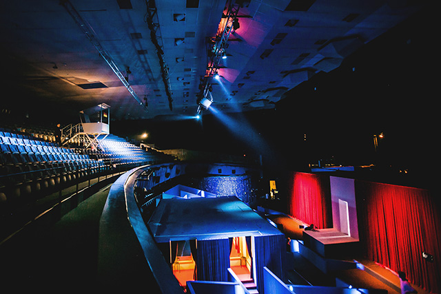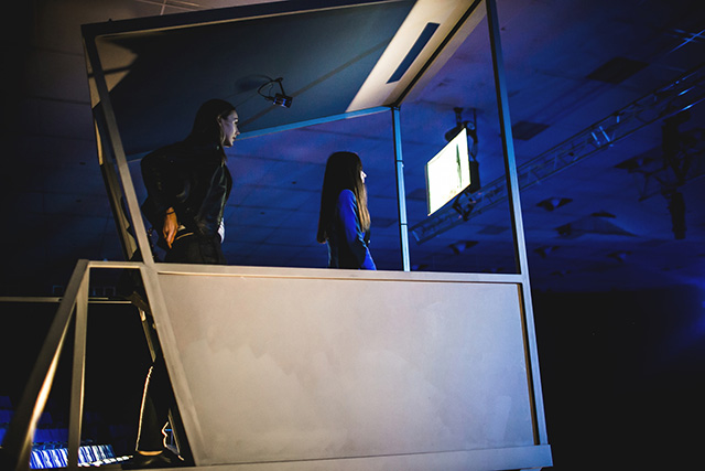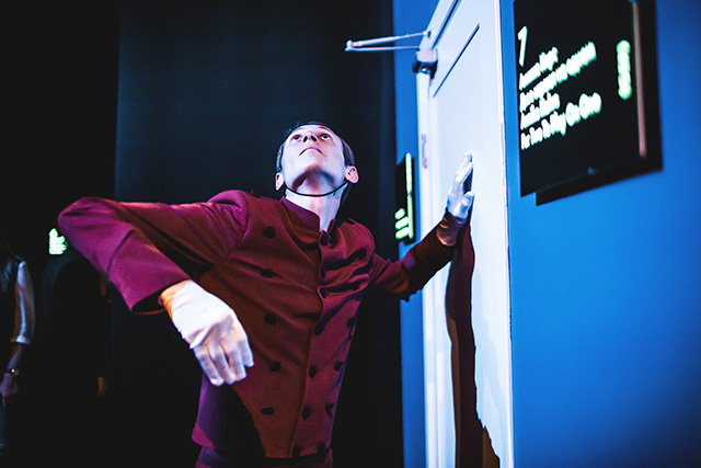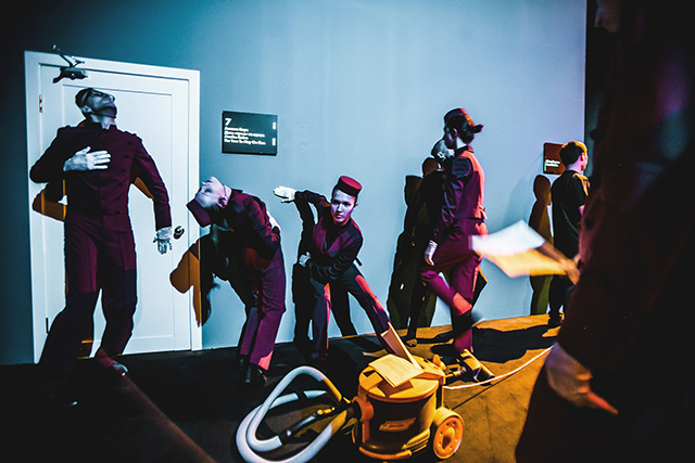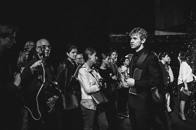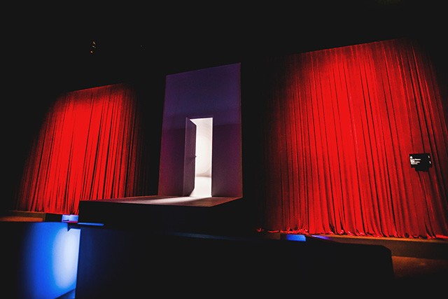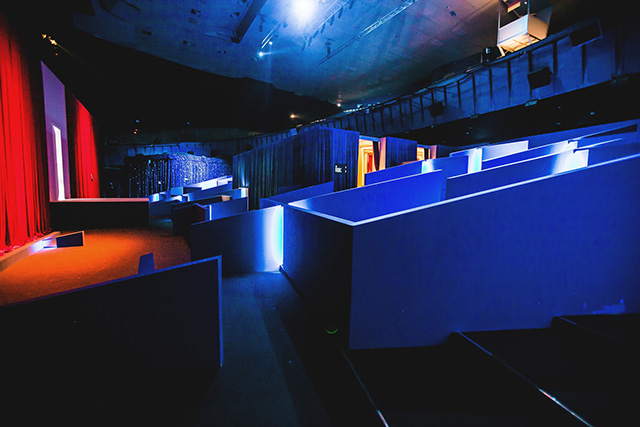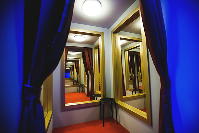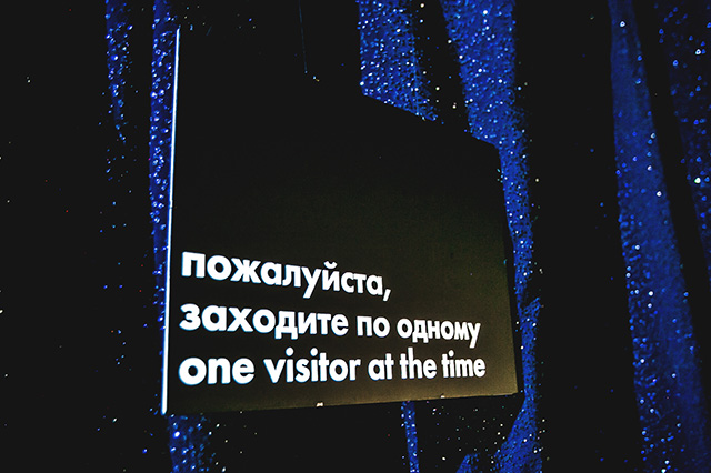 Здесь вообще все очень таинственно: занавесы, закрытые двери, а за ними — видеоарт, инсталляции и, разумеется, перформансы. Есть и пространственные эксперименты — например, работа Лукаса Симоеса «Замкнутое измерение», представляющая собой лабиринт, протянувшийся от зрительного зала к сцене, с постепенно снижающимися по ходу движения стенами — от 207 сантиметров к едва заметным 15. Выход из него есть — прямиком к «Двери» Вадима Фишкина, которая становится границей между реальным и ирреальным. Что происходит по ту сторону полуотворенной двери — вопрос открытый, и найти ответ на него каждому предстоит самостоятельно. Что касается сцены театра «Россия», то артистов мюзиклов на ней сменил кинетизм в лице виднейшего его представителя Хулио Ле Парка.