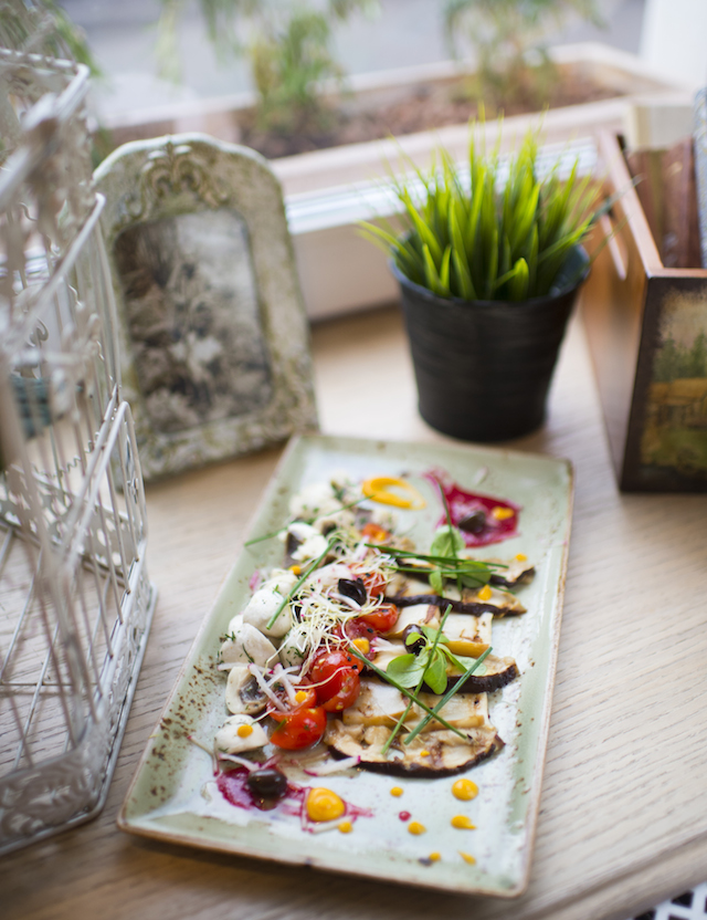 Карпаччо из белых грибов с салатом из маринованных шампиньонов и помидоров